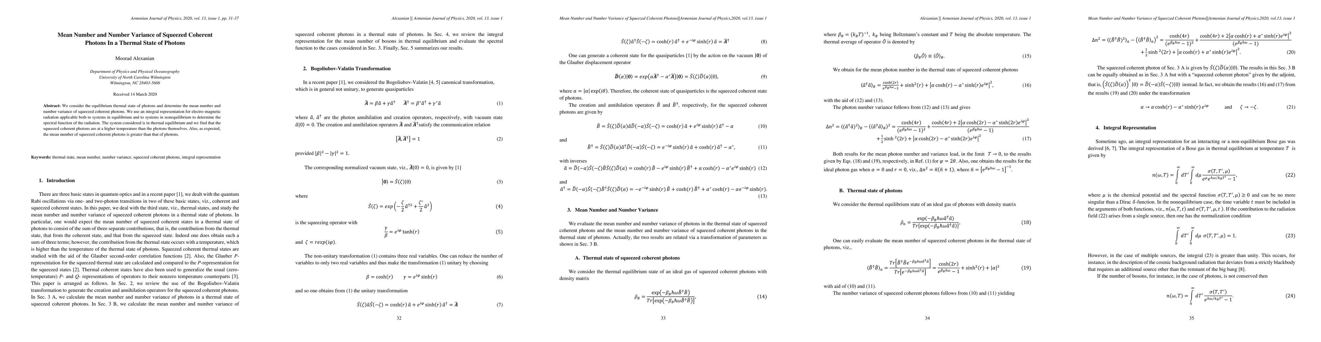This research determines the mean number and variance of squeezed coherent photons in an equilibrium thermal state, finding that they exhibit higher temperatures and greater mean counts compared to regular photons, using an integral representation for electromagnetic radiation.