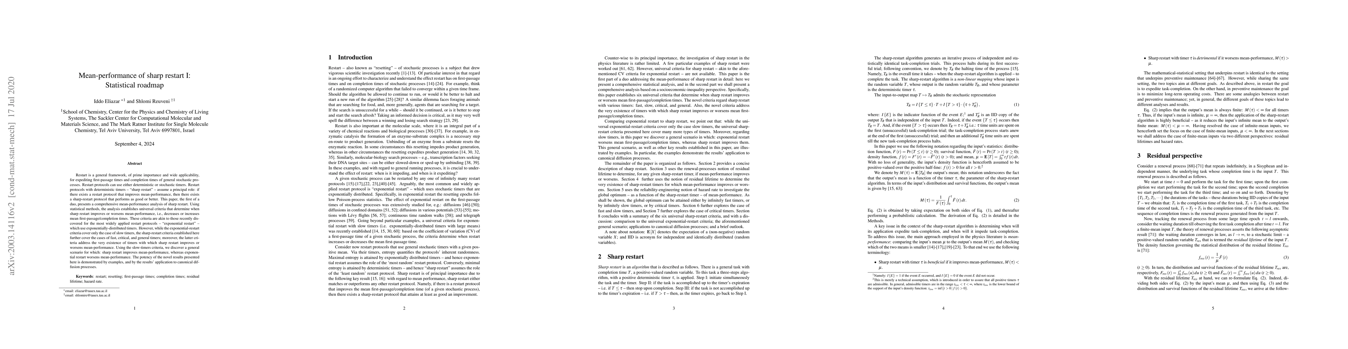 Restart is a general framework, of prime importance and wide applicability, for expediting first-passage times and completion times of general stochastic processes. Restart protocols can use either deterministic or stochastic timers. Restart protocols with deterministic timers -- "sharp restart" -- assume a principal role: if there exists a restart protocol that improves mean-performance, then there exists a sharp-restart protocol that performs as good or better. This paper, the first of a duo, presents a comprehensive mean-performance analysis of sharp restart. Using statistical methods, the analysis establishes universal criteria that determine when sharp restart improves or worsens mean-performance, i.e., decreases or increases mean first-passage/completion times. These criteria are akin to those recently discovered for the most widely applied restart protocols -- "exponential restart" -- which use exponentially-distributed timers. However, while the exponential-restart criteria cover only the case of slow timers, the sharp-restart criteria established here further cover the cases of fast, critical, and general timers; moreover, the latter criteria address the very existence of timers with which sharp restart improves or worsens mean-performance. Using the slow-timers criteria, we discover a general scenario for which: sharp restart improves mean-performance, whereas exponential restart worsens mean-performance. The potency of the novel results presented here is demonstrated by examples, and by the results' application to canonical diffusion processes.