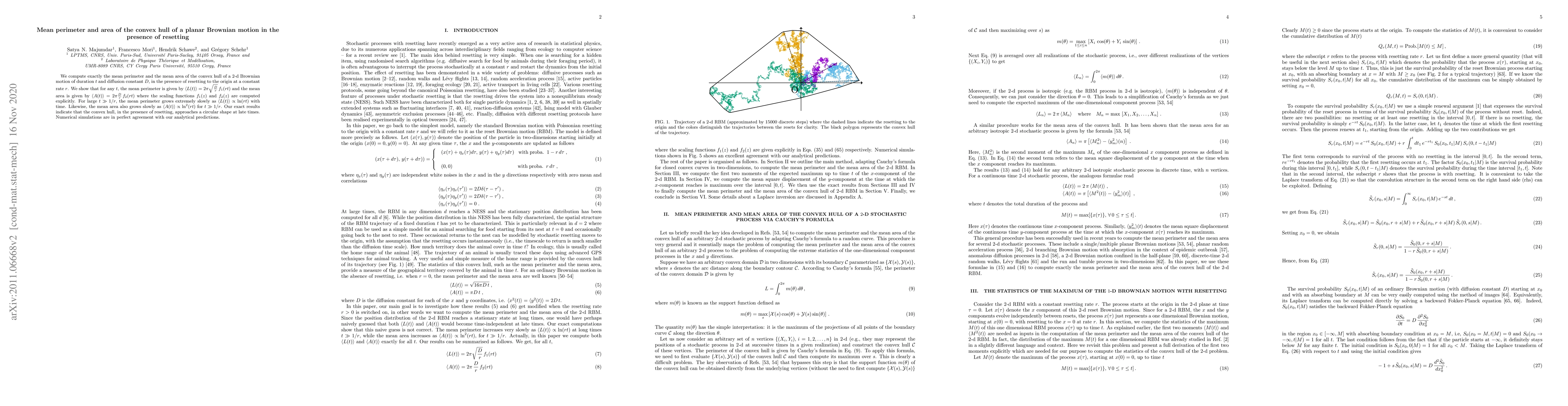 This paper computes the mean perimeter and area of the convex hull of a 2-D Brownian motion with resetting to the origin, showing that both grow logarithmically for large times. The exact expressions for mean perimeter and area are derived, indicating a circular shape at late times, consistent with numerical simulations.