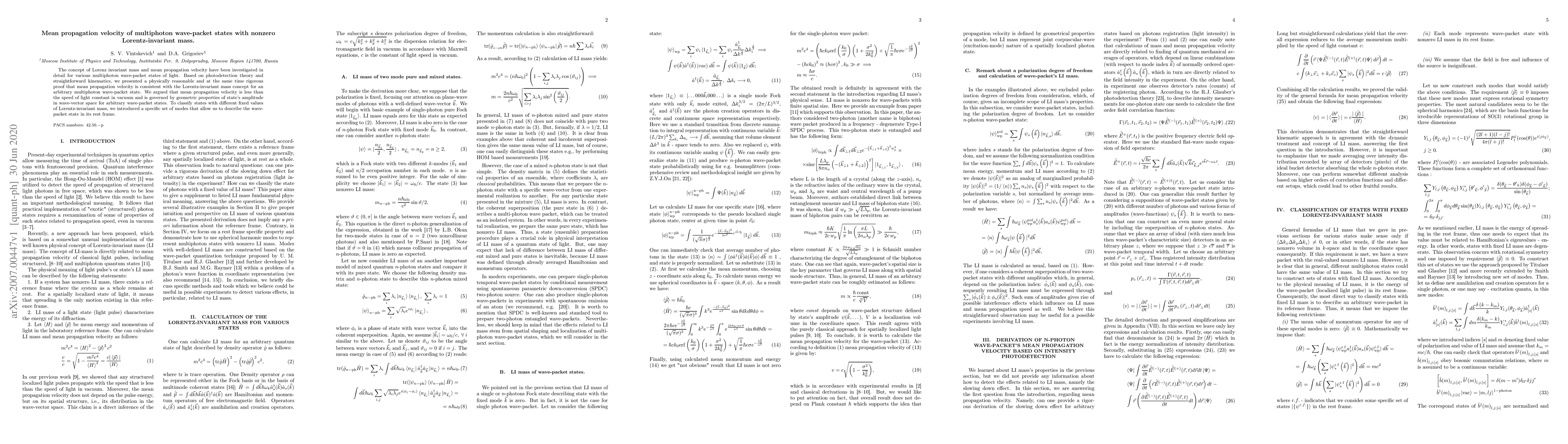 This paper investigates the mean propagation velocity of multiphoton light states, demonstrating that it aligns with the Lorentz-invariant mass concept. It argues that this velocity is always less than the speed of light, influenced by the wave-packet's geometric properties, and introduces specific modes to classify states by their fixed Lorentz-invariant mass values.