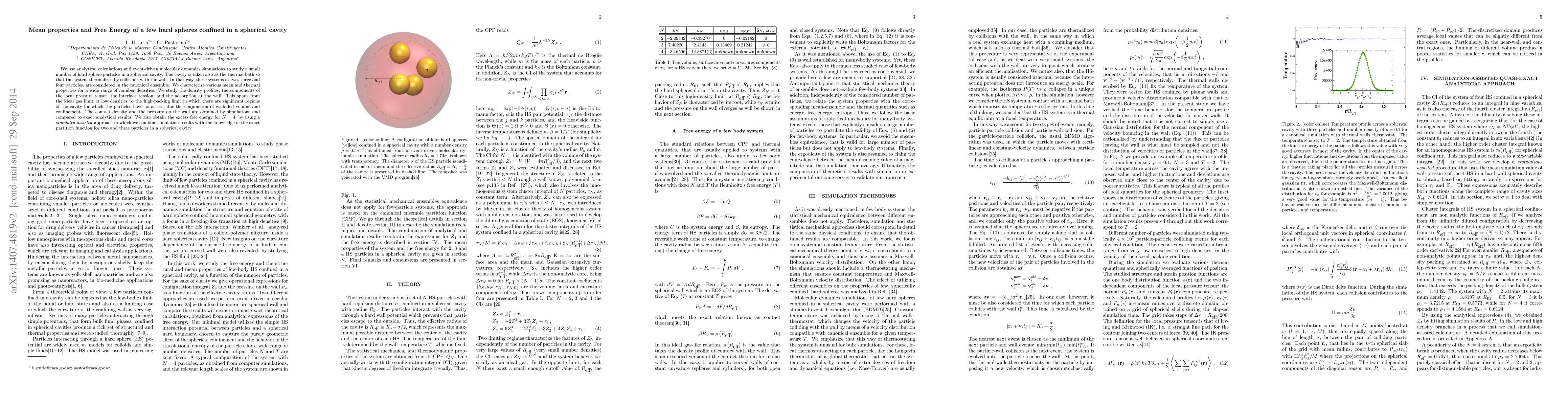 This research uses analytical and simulation methods to study hard sphere particles in a spherical cavity, characterizing properties like density profiles, pressure tensor components, and interface tension for various densities. It also derives the excess free energy for four particles by combining simulations and exact partition function knowledge for smaller systems.