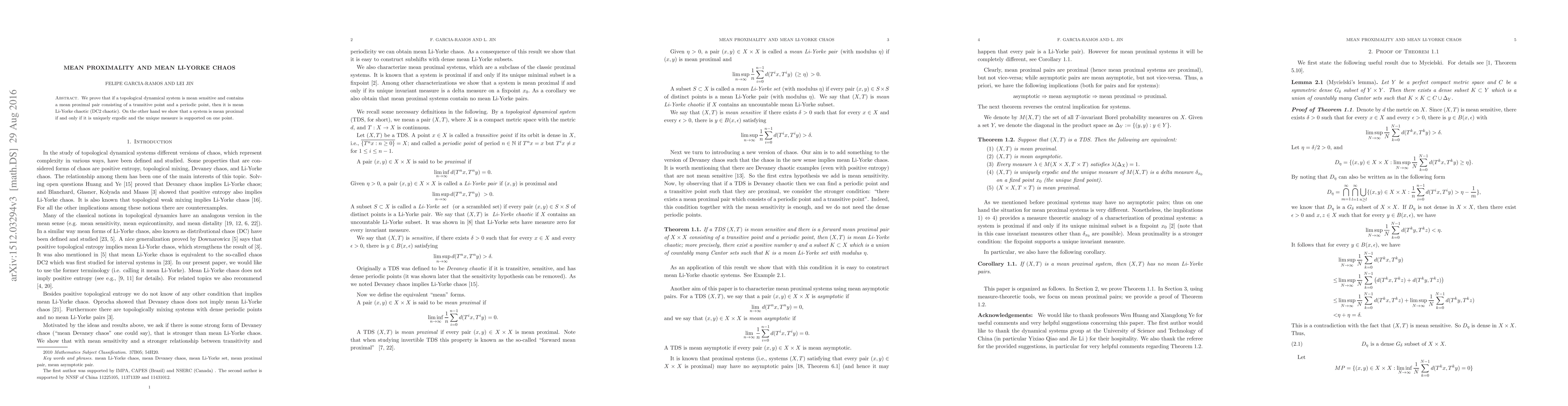 We prove that if a topological dynamical system is mean sensitive and contains a mean proximal pair consisting of a transitive point and a periodic point, then it is mean Li-Yorke chaotic (DC2 chaotic). On the other hand we show that a system is mean proximal if and only if it is uniquely ergodic and the unique measure is supported on one point.