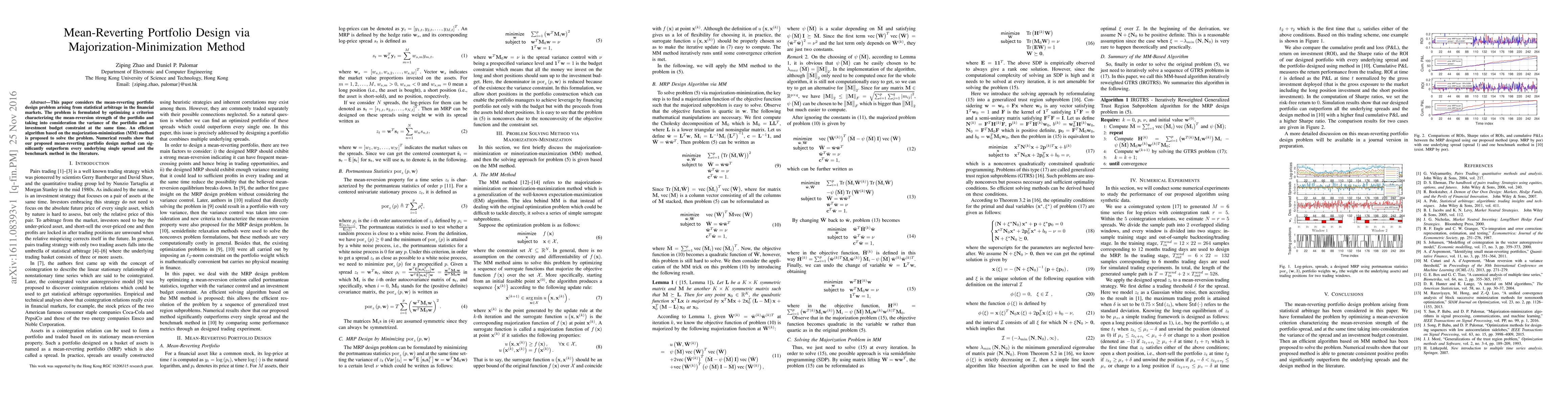 This paper considers the mean-reverting portfolio design problem arising from statistical arbitrage in the financial markets. The problem is formulated by optimizing a criterion characterizing the mean-reversion strength of the portfolio and taking into consideration the variance of the portfolio and an investment budget constraint at the same time. An efficient algorithm based on the majorization-minimization (MM) method is proposed to solve the problem. Numerical results show that our proposed mean-reverting portfolio design method can significantly outperform every underlying single spread and the benchmark method in the literature.
