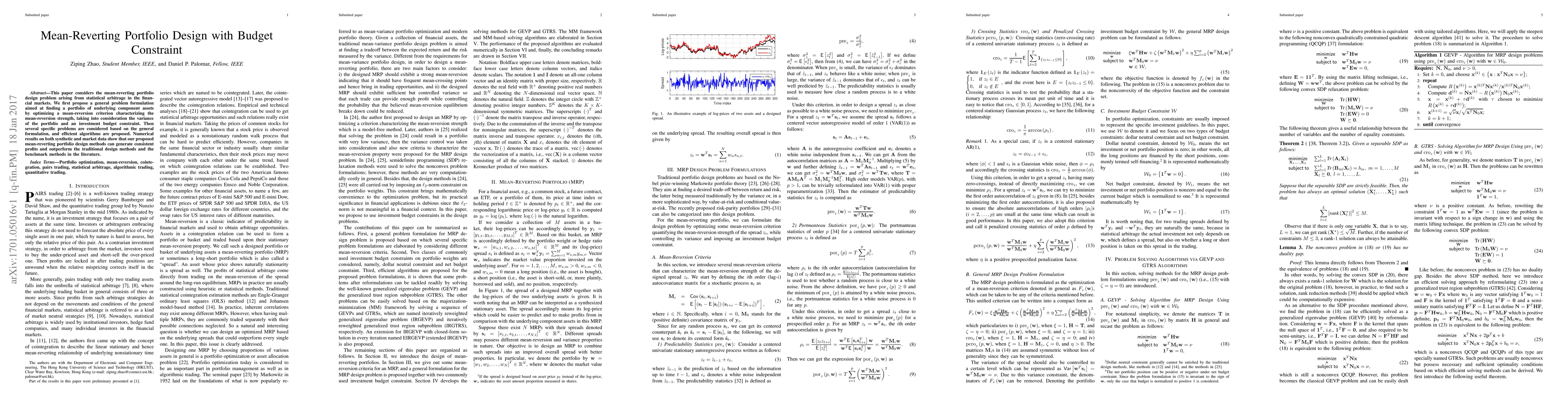 This paper considers the mean-reverting portfolio design problem arising from statistical arbitrage in the financial markets. We first propose a general problem formulation aimed at finding a portfolio of underlying component assets by optimizing a mean-reversion criterion characterizing the mean-reversion strength, taking into consideration the variance of the portfolio and an investment budget constraint. Then several specific problems are considered based on the general formulation, and efficient algorithms are proposed. Numerical results on both synthetic and market data show that our proposed mean-reverting portfolio design methods can generate consistent profits and outperform the traditional design methods and the benchmark methods in the literature.