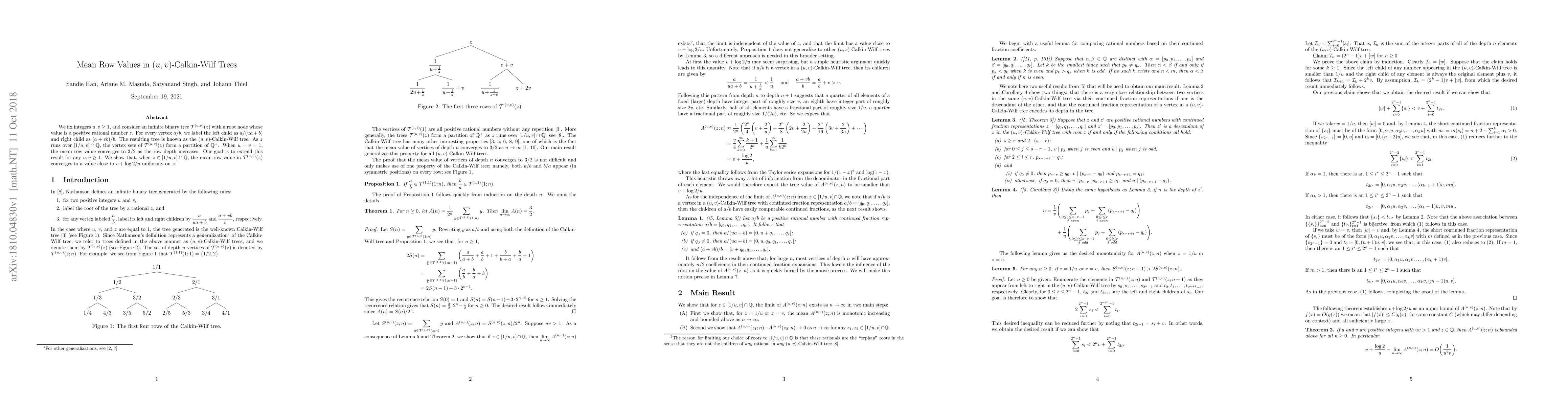 The paper investigates the mean row values in $(u,v)$-Calkin-Wilf trees for integers $u,v geq 1$, finding that they converge to a value close to $v+rac{ extlog{2}}{u}$ as the row depth increases, with implications for partitioning rational numbers.