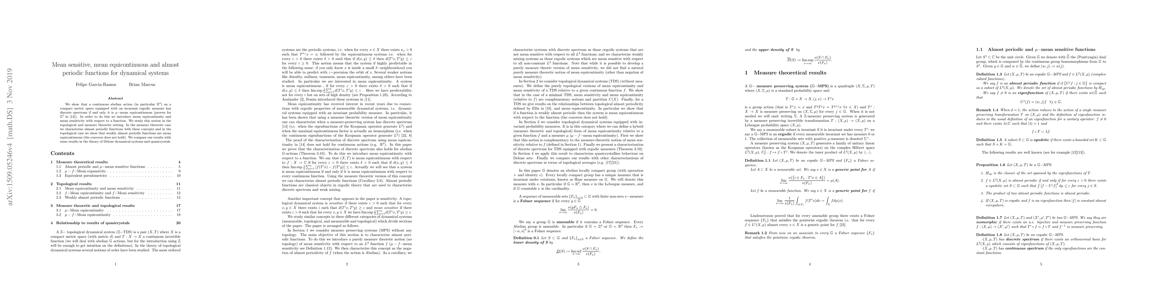 We show that an $R^d$-topological dynamical system equipped with an invariant ergodic measure has discrete spectrum if and only it is $\mu$-mean equicontinuous (proven for $Z^d$ before). In order to do this we introduce mean equicontinuity and mean sensitivity with respect to a function. We study this notion in the topological and measure theoretic setting. In the measure theoretic case we characterize almost periodic functions and in the topological case we show that weakly almost periodic functions are mean equicontinuous (the converse does not hold).