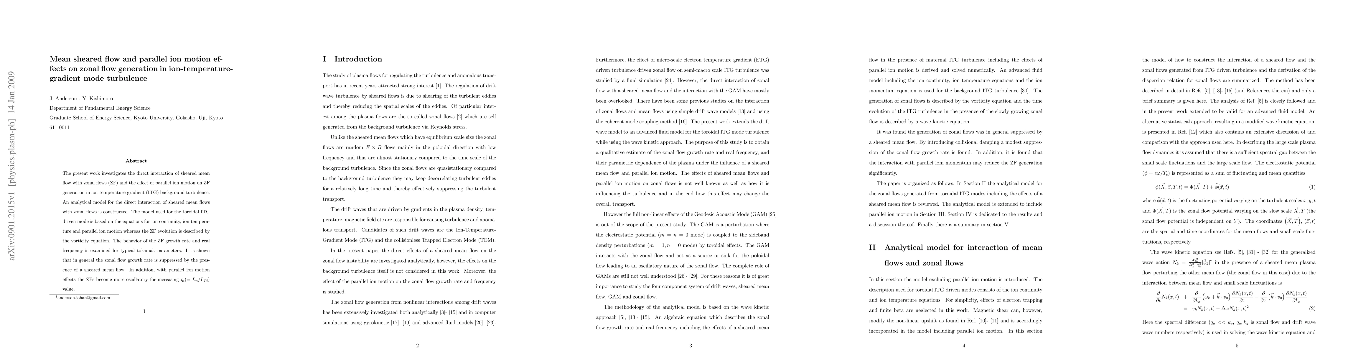 The paper presents an extended analytical model for zonal flow generation that includes parallel ion momentum, providing a more comprehensive understanding of zonal flow dynamics in ITG turbulence under sheared mean flows.