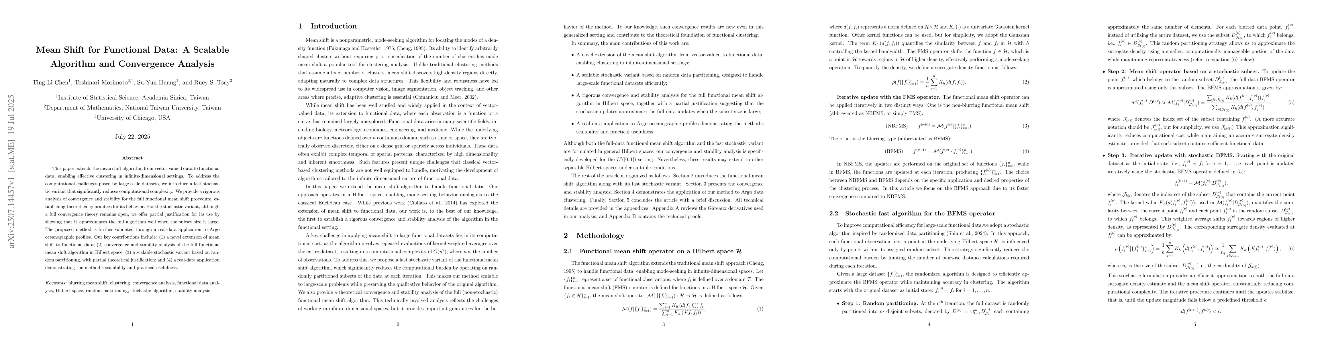 The paper presents a rigorous convergence and stability analysis for the full functional mean shift procedure and develops a scalable stochastic variant with partial theoretical justification.