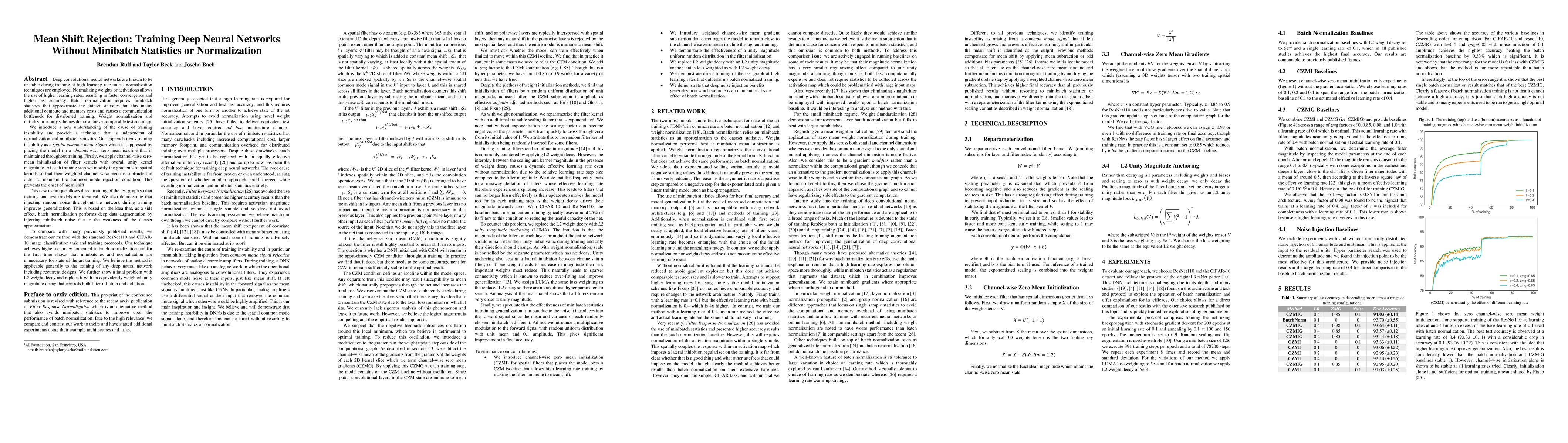 Deep convolutional neural networks are known to be unstable during training at high learning rate unless normalization techniques are employed. Normalizing weights or activations allows the use of higher learning rates, resulting in faster convergence and higher test accuracy. Batch normalization requires minibatch statistics that approximate the dataset statistics but this incurs additional compute and memory costs and causes a communication bottleneck for distributed training. Weight normalization and initialization-only schemes do not achieve comparable test accuracy. We introduce a new understanding of the cause of training instability and provide a technique that is independent of normalization and minibatch statistics. Our approach treats training instability as a spatial common mode signal which is suppressed by placing the model on a channel-wise zero-mean isocline that is maintained throughout training. Firstly, we apply channel-wise zero-mean initialization of filter kernels with overall unity kernel magnitude. At each training step we modify the gradients of spatial kernels so that their weighted channel-wise mean is subtracted in order to maintain the common mode rejection condition. This prevents the onset of mean shift. This new technique allows direct training of the test graph so that training and test models are identical. We also demonstrate that injecting random noise throughout the network during training improves generalization. This is based on the idea that, as a side effect, batch normalization performs deep data augmentation by injecting minibatch noise due to the weakness of the dataset approximation. Our technique achieves higher accuracy compared to batch normalization and for the first time shows that minibatches and normalization are unnecessary for state-of-the-art training.