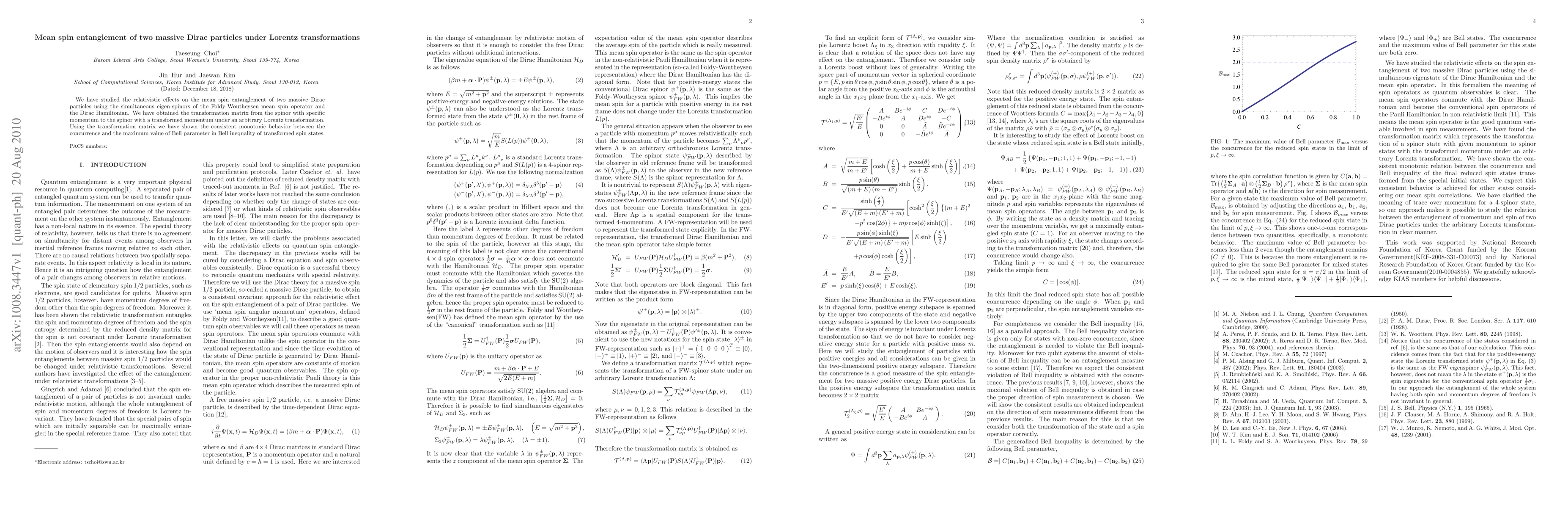 This paper investigates the relativistic impact on mean spin entanglement of two massive Dirac particles via Lorentz transformations, revealing a consistent monotonic relationship between concurrence and the maximum value of the Bell parameter in transformed spin states.