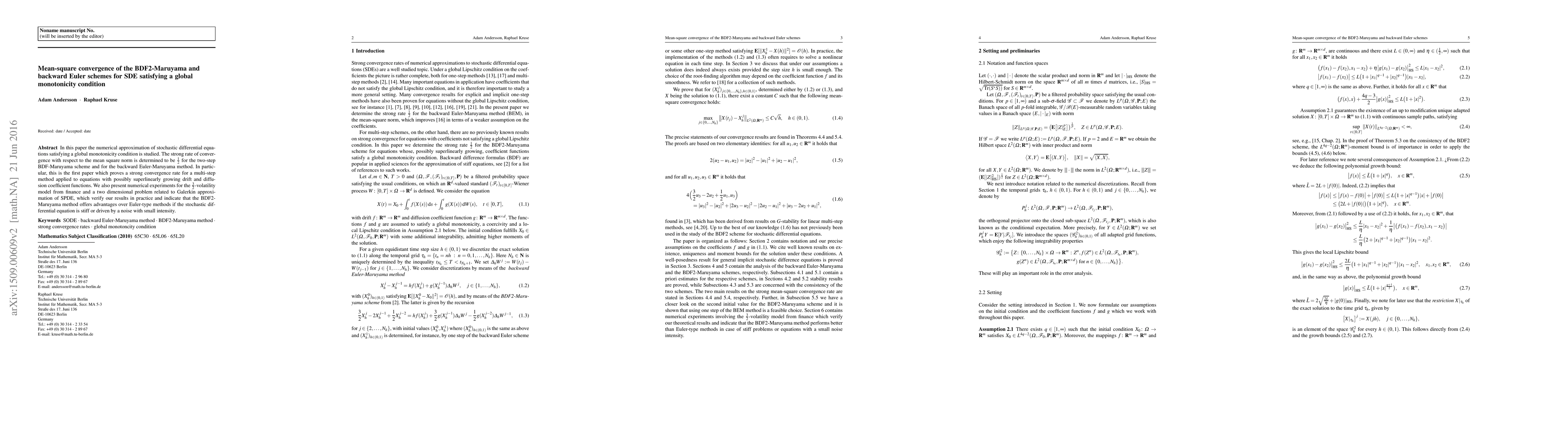 This paper investigates the mean-square convergence of the BDF2-Maruyama and backward Euler schemes for stochastic differential equations with global monotonicity. It establishes a strong convergence rate of $\frac{1}{2}$ for both methods, highlighting the BDF2-Maruyama's advantages for stiff equations and low noise intensity.