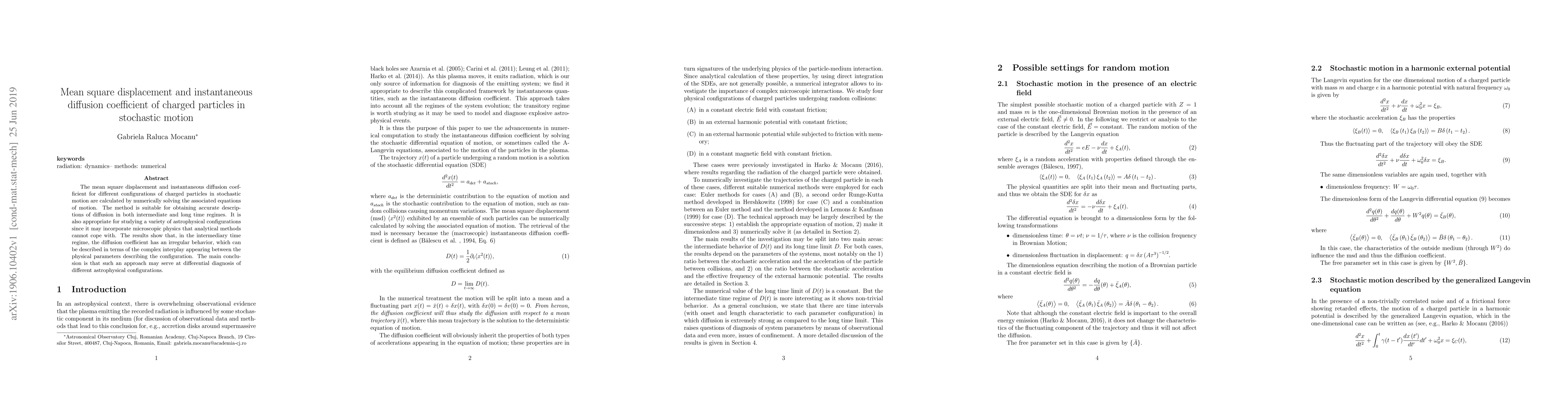 The mean square displacement and instantaneous diffusion coefficient for different configurations of charged particles in stochastic motion are calculated by numerically solving the associated equations of motion. The method is suitable for obtaining accurate descriptions of diffusion in both intermediate and long time regimes. It is also appropriate for studying a variety of astrophysical configurations since it may incorporate microscopic physics that analytical methods cannot cope with. The results show that, in the intermediary time regime, the diffusion coefficient has an irregular behavior, which can be described in terms of the complex interplay appearing between the physical parameters describing the configuration. The main conclusion is that such an approach may serve at differential diagnosis of different astrophysical configurations.
