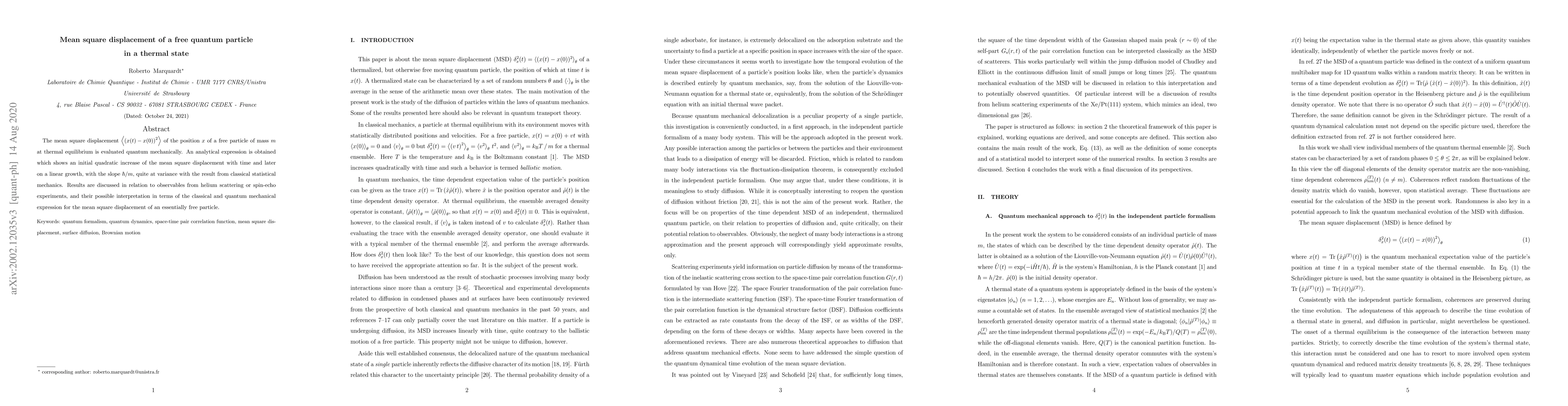 This paper evaluates the quantum mechanical mean square displacement of a free particle in thermal equilibrium, revealing an initial quadratic time dependence followed by a linear growth with slope $\hbar/m$, contrasting with classical mechanics. The findings are relevant for interpreting results from helium scattering and spin-echo experiments.