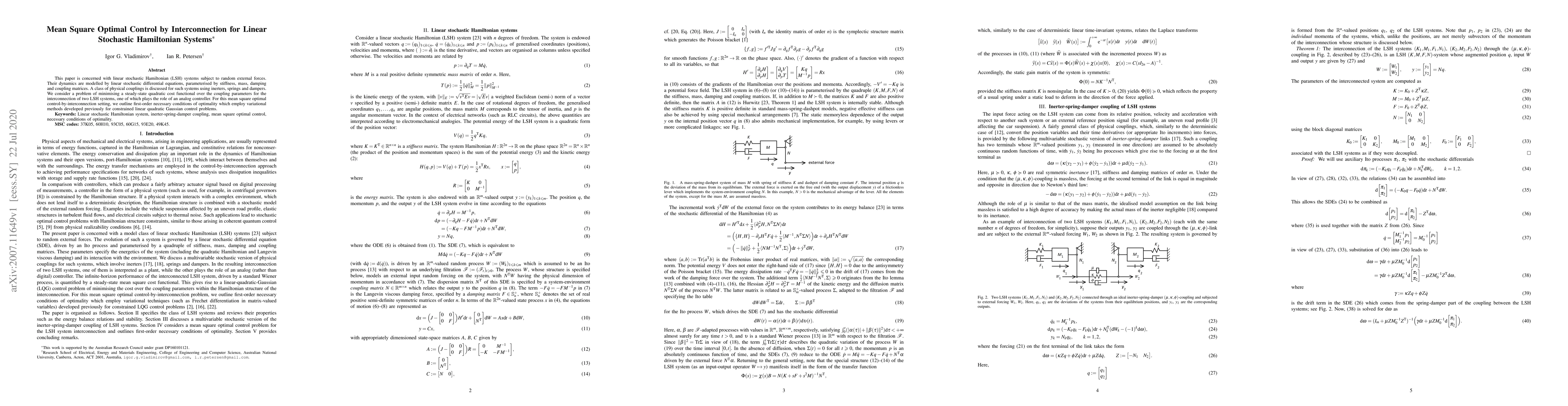 This paper investigates linear stochastic Hamiltonian systems under random forces, focusing on optimal control via interconnection. It proposes a method to minimize a steady-state quadratic cost functional by adjusting coupling parameters, using variational techniques from constrained linear quadratic Gaussian control.