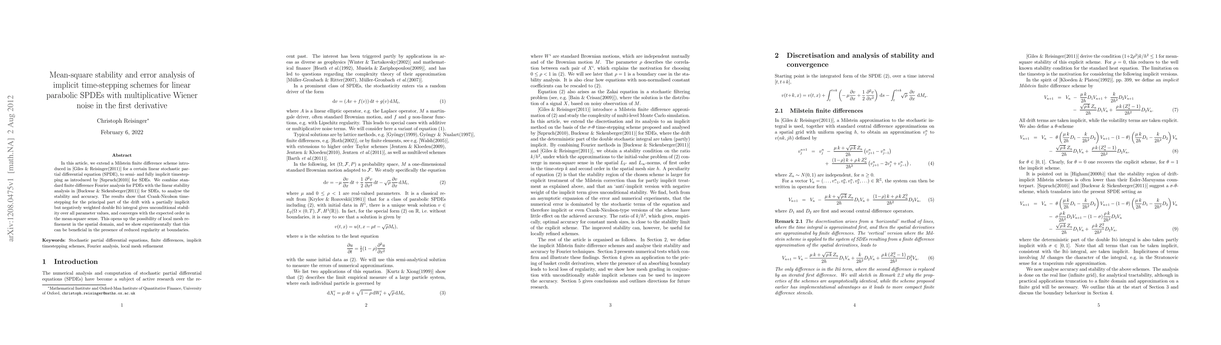 In this article, we extend a Milstein finite difference scheme introduced in [Giles & Reisinger(2011)] for a certain linear stochastic partial differential equation (SPDE), to semi- and fully implicit timestepping as introduced by [Szpruch(2010)] for SDEs. We combine standard finite difference Fourier analysis for PDEs with the linear stability analysis in [Buckwar & Sickenberger(2011)] for SDEs, to analyse the stability and accuracy. The results show that Crank-Nicolson timestepping for the principal part of the drift with a partially implicit but negatively weighted double It\^o integral gives unconditional stability over all parameter values, and converges with the expected order in the mean-square sense. This opens up the possibility of local mesh refinement in the spatial domain, and we show experimentally that this can be beneficial in the presence of reduced regularity at boundaries.