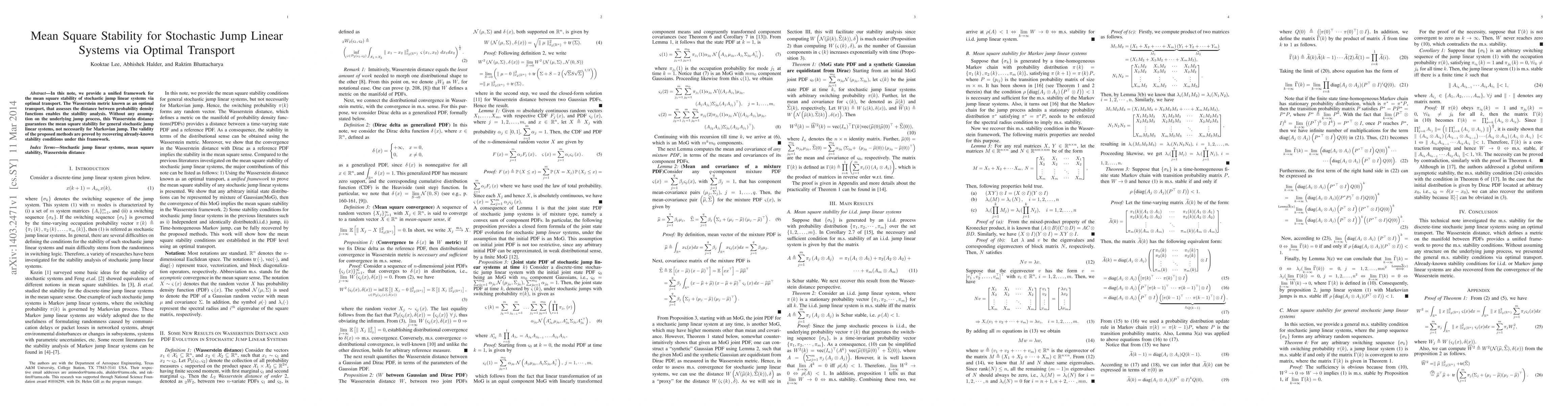 In this note, we provide a unified framework for the mean square stability of stochastic jump linear systems via optimal transport. The Wasserstein metric known as an optimal transport, that assesses the distance between probability density functions enables the stability analysis. Without any assumption on the underlying jump process, this Wasserstein distance guarantees the mean square stability for general stochastic jump linear systems, not necessarily for Markovian jump. The validity of the proposed methods are proved by recovering already-known stability conditions under this framework.