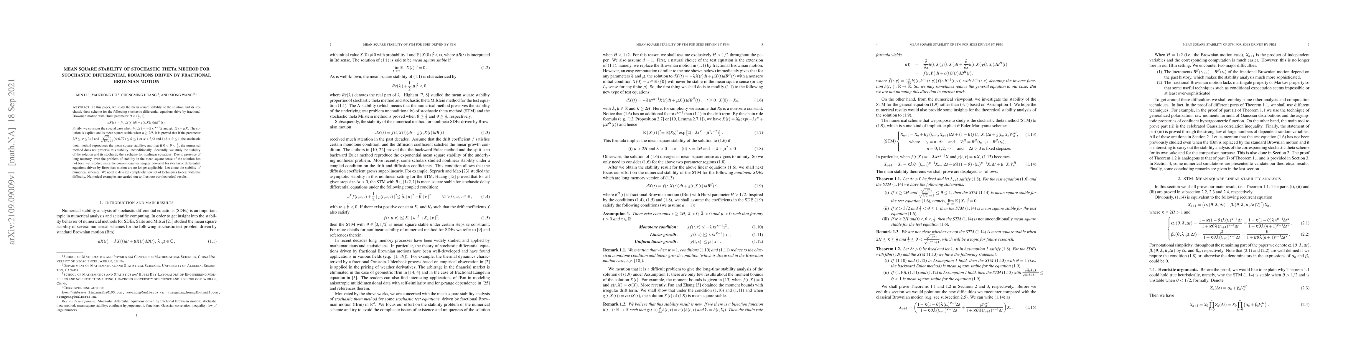 In this paper, we study the mean-square stability of the solution and its stochastic theta scheme for the following stochastic differential equations drive by fractional Brownian motion with Hurst parameter $H\in (\frac 12,1)$: $$ dX(t)=f(t,X(t))dt+g(t,X(t))dB^{H}(t). $$ Firstly, we consider the special case when $f(t,X)=-\lambda\kappa t^{\kappa-1}X$ and $g(t,X)=\mu X$. The solution is explicit and is mean-square stable when $\kappa\geq 2H$. It is proved that if the parameter $2H\leq\kappa\le 3/2$ and $\frac{\sqrt{3/2}\cdot e}{\sqrt{3/2}\cdot e+1} (\approx 0.77)\leq \theta\leq 1$ or $\kappa>3/2$ and $1/2<\theta\le 1$, the stochastic theta method reproduces the mean-square stability; and that if $0<\theta<\frac 12$, the numerical method does not preserve this stability unconditionally. Secondly, we study the stability of the solution and its stochastic theta scheme for nonlinear equations. Due to the presence of long memory, even the problem of stability in the mean square sense of the solution has not been well studied since the conventional techniques powerful for stochastic differential equations driven by Brownian motion are no longer applicable. Let alone the stability of numerical schemes. We need to develop a completely new set of techniques to deal with this difficulty. Numerical examples are carried out to illustrate our theoretical results.