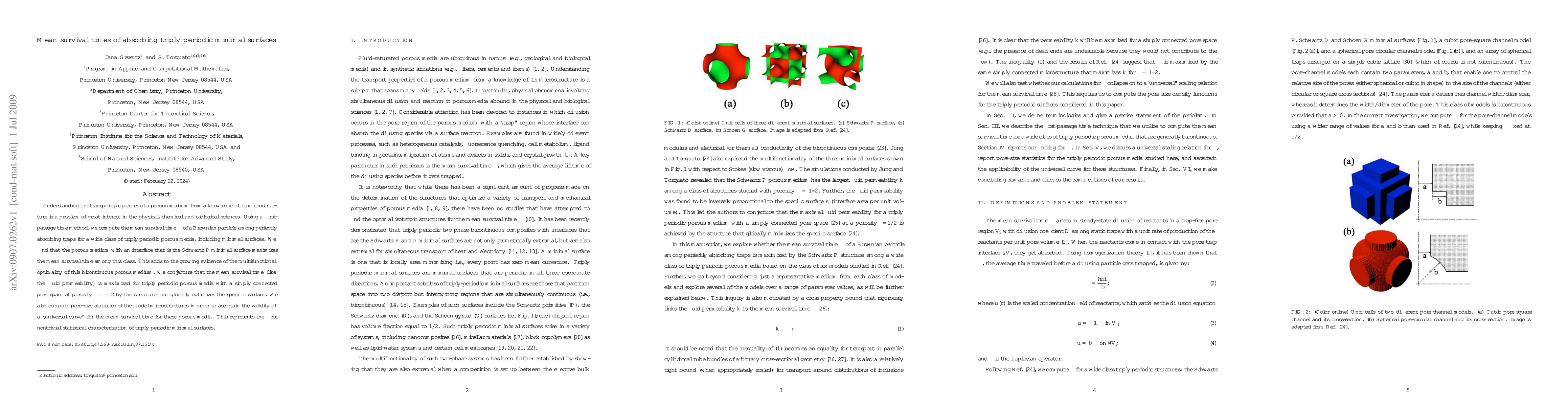 Understanding the transport properties of a porous medium from a knowledge of its microstructure is a problem of great interest in the physical, chemical and biological sciences. Using a first-passage time method, we compute the mean survival time $\tau$ of a Brownian particle among perfectly absorbing traps for a wide class of triply-periodic porous media, including minimal surfaces. We find that the porous medium with an interface that is the Schwartz P minimal surface maximizes the mean survival time among this class. This adds to the growing evidence of the multifunctional optimality of this bicontinuous porous medium. We conjecture that the mean survival time (like the fluid permeability) is maximized for triply periodic porous media with a simply connected pore space at porosity $\phi=1/2$ by the structure that globally optimizes the specific surface. We also compute pore-size statistics of the model microstructures in order to ascertain the validity of a "universal curve" for the mean survival time for these porous media. This represents the first nontrivial statistical characterization of triply periodic minimal surfaces.