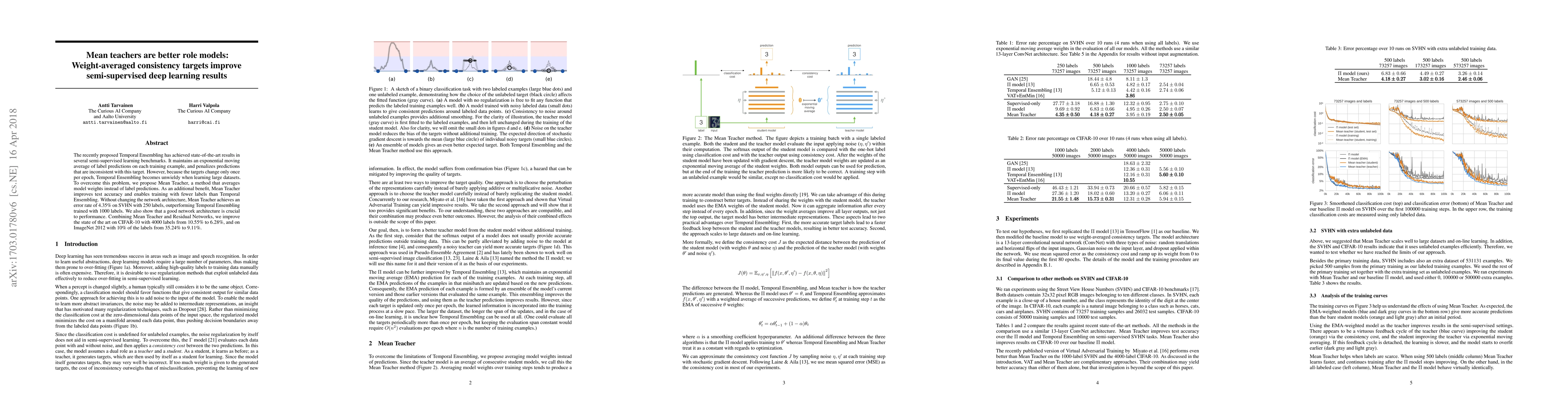 The paper proposes Mean Teacher, a semi-supervised deep learning method that averages model weights instead of label predictions, improving upon Temporal Ensembling for large datasets and enabling training with fewer labels. It combines Mean Teacher with Residual Networks to achieve state-of-the-art results on CIFAR-10 and ImageNet.