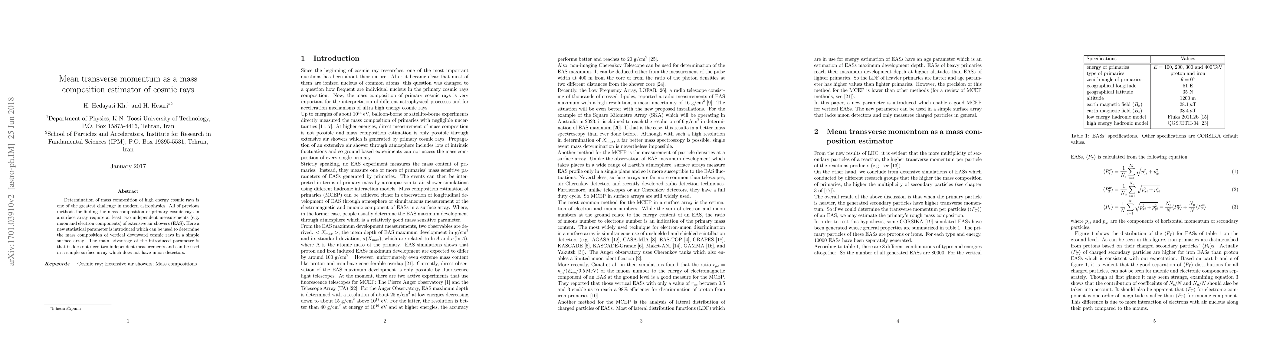 This paper introduces a new statistical parameter for estimating the mass composition of high-energy cosmic rays using only mean transverse momentum in a simple surface array, eliminating the need for additional detectors like muon detectors. This method simplifies the analysis of cosmic ray mass composition.