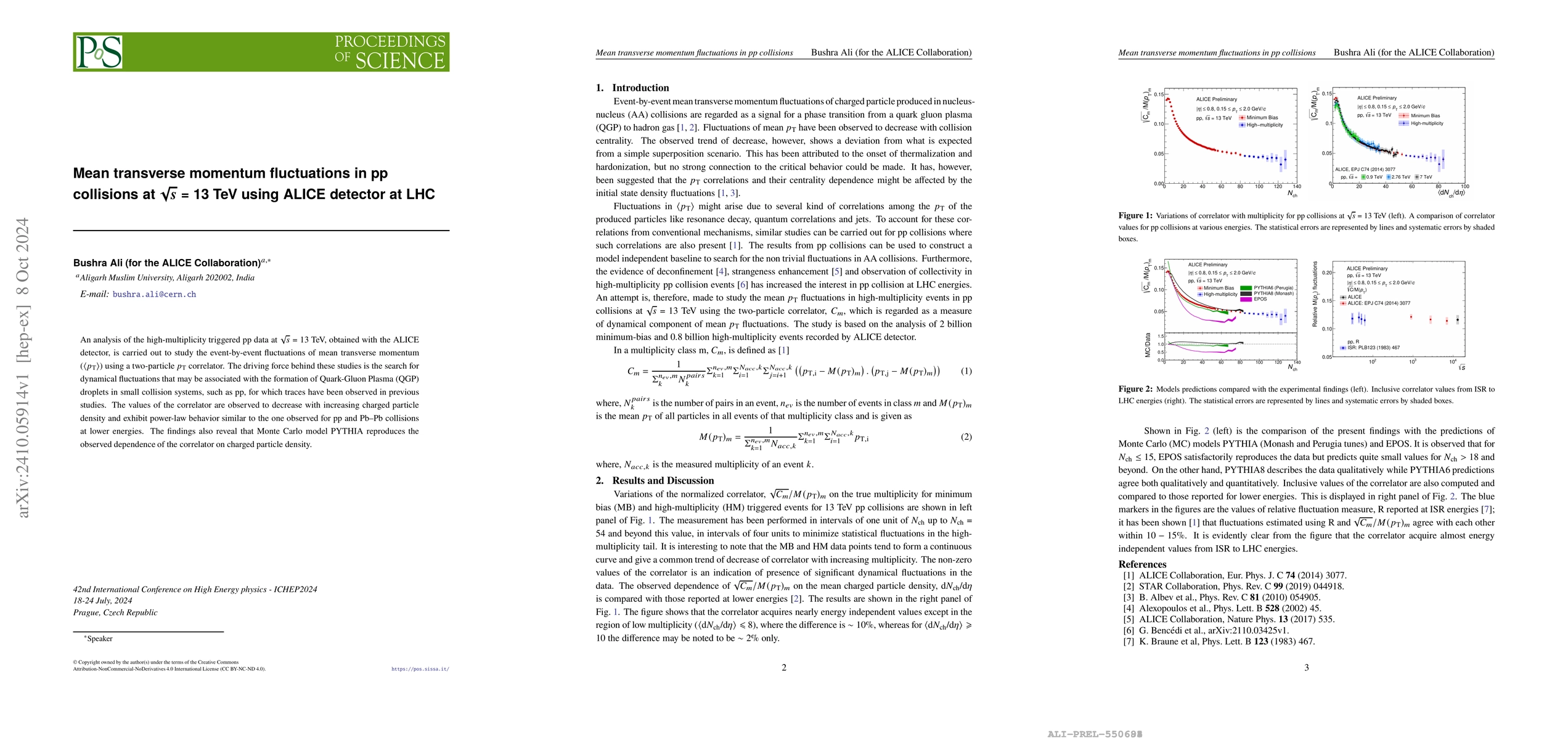 This study analyzes mean transverse momentum fluctuations in high-multiplicity proton-proton collisions at 13 TeV using ALICE detector data, seeking evidence of Quark-Gluon Plasma formation. Results show correlator values decrease with charged particle density and follow a power-law behavior, consistent with Monte Carlo simulations by PYTHIA.