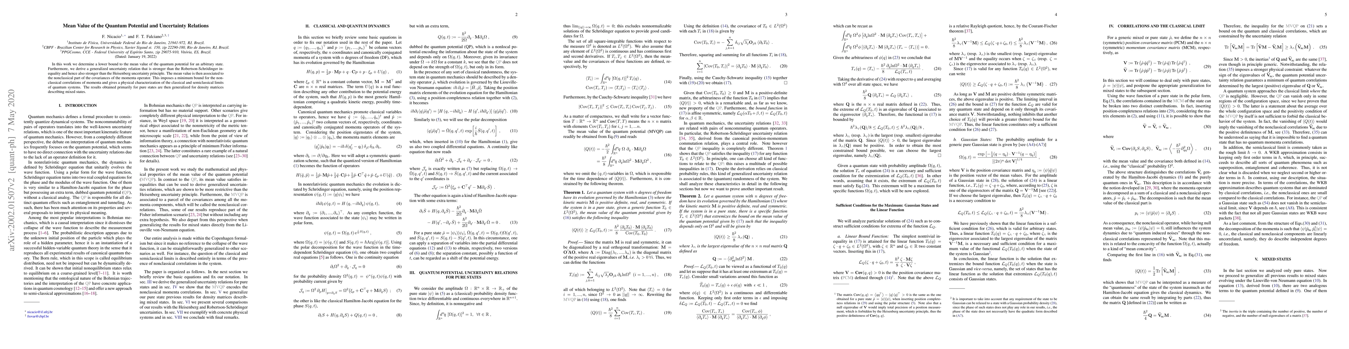 In this work we determine a lower bound to the mean value of the quantum potential for an arbitrary state. Furthermore, we derive a generalized uncertainty relation that is stronger than the Robertson-Schr\"odinger inequality and hence also stronger than the Heisenberg uncertainty principle. The mean value is then associated to the nonclassical part of the covariances of the momenta operator. This imposes a minimum bound for the nonclassical correlations of momenta and gives a physical characterization of the classical and semiclassical limits of quantum systems. The results obtained primarily for pure states are then generalized for density matrices describing mixed states.