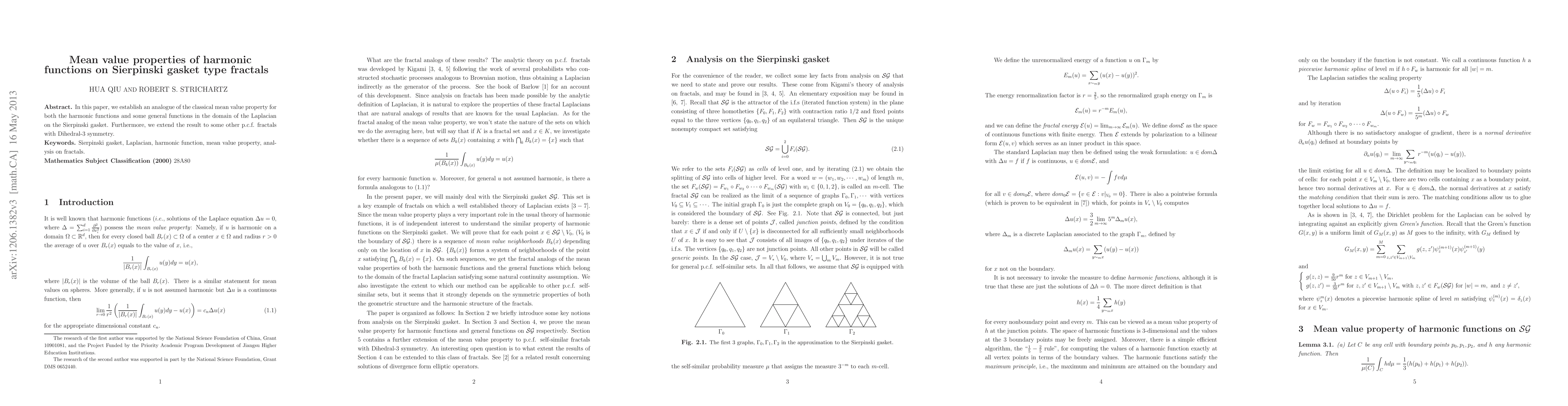 Summary: This paper establishes a mean value property analogue for harmonic functions on Sierpinski gasket fractals and extends the result to other p.c.f. fractals with Dihedral-3 symmetry, generalizing the classical mean value property in this fractal context.