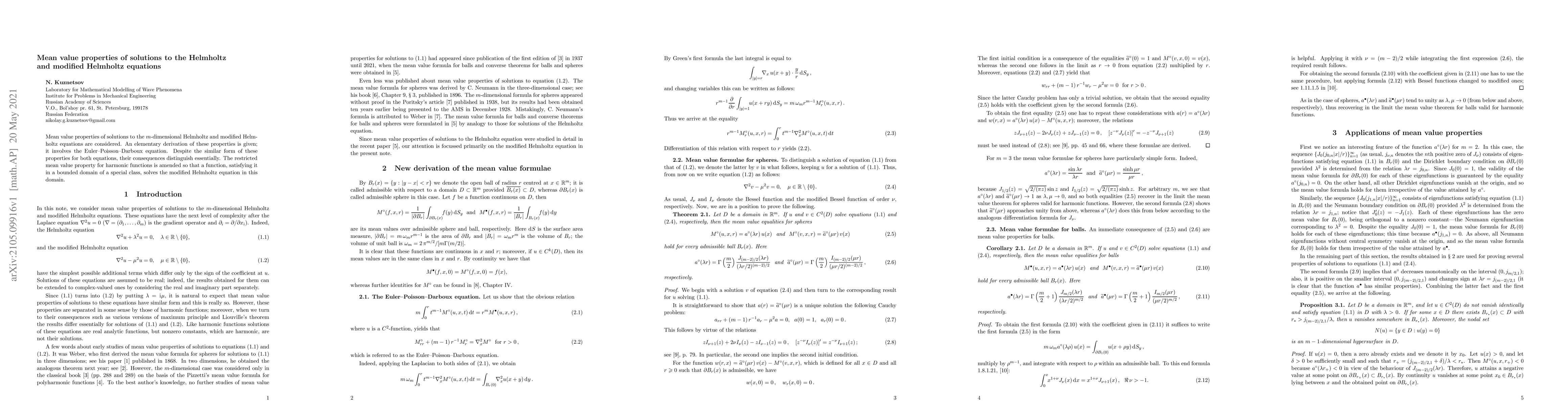 Mean value properties of solutions to the $m$-dimensional Helmholtz and modified Helmholtz equations are considered. An elementary derivation of these properties is given; it involves the Euler--Poisson--Darboux equation. Despite the similar form of these properties for both equations, their consequences distinguish essentially. The restricted mean value property for harmonic functions is amended so that a function, satisfying it in a bounded domain of a special class, solves the modified Helmholtz equation in this domain.