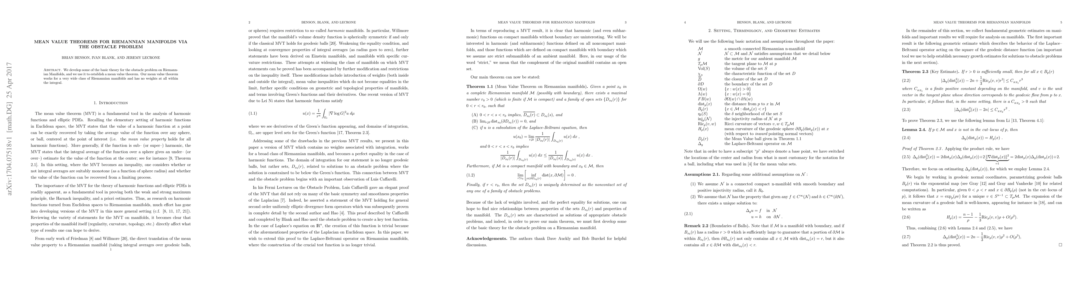 Summary: This paper develops the foundational theory for the obstacle problem on Riemannian manifolds and utilizes it to establish a mean value theorem applicable to a broad range of these manifolds without requiring any integral weights.