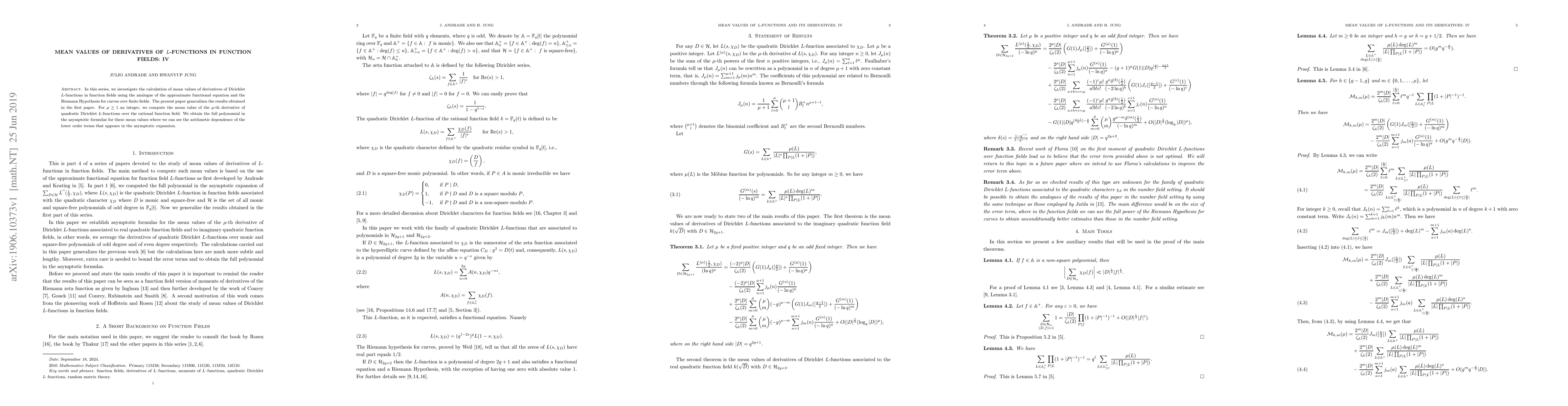This paper generalizes previous results on mean values of Dirichlet $L$-function derivatives in function fields, employing the approximate functional equation and Riemann Hypothesis for curves over finite fields. It computes the full polynomial asymptotic formulae for the mean values of the $\mu$-th derivative of quadratic Dirichlet $L$-functions over the rational function field, revealing the arithmetic dependence of lower-order terms.