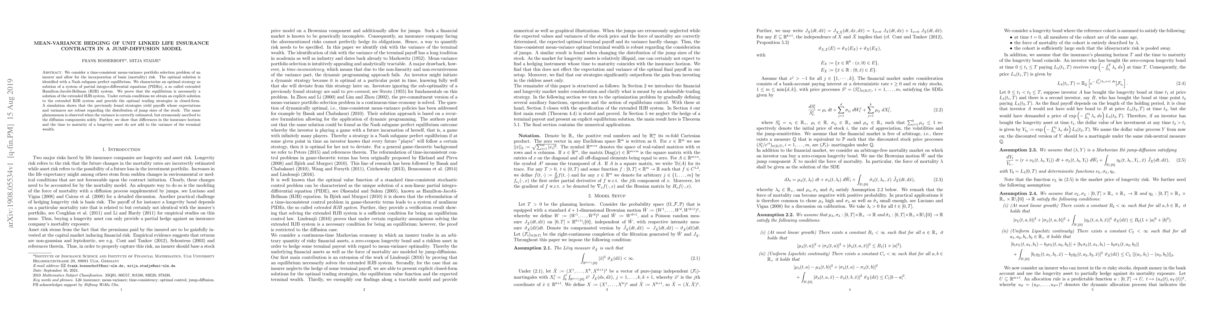 This paper develops a mean-variance hedging strategy for unit-linked life insurance contracts within a jump-diffusion model, identifying an optimal solution via a Nash subgame perfect equilibrium and solving a system of partial integro-differential equations. The study finds that the optimal strategies yield robust payoffs and that differences in insurance and asset maturity do not affect terminal wealth variance.
