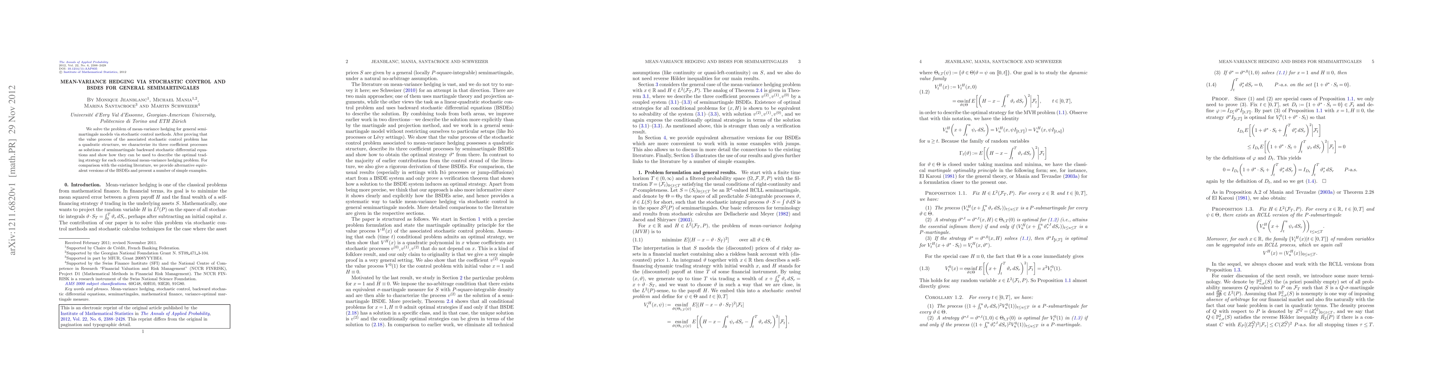 This paper solves mean-variance hedging for semimartingale models using stochastic control, demonstrating that the value process exhibits a quadratic structure. It characterizes the coefficient processes via semimartingale backward stochastic differential equations, which define the optimal trading strategy.