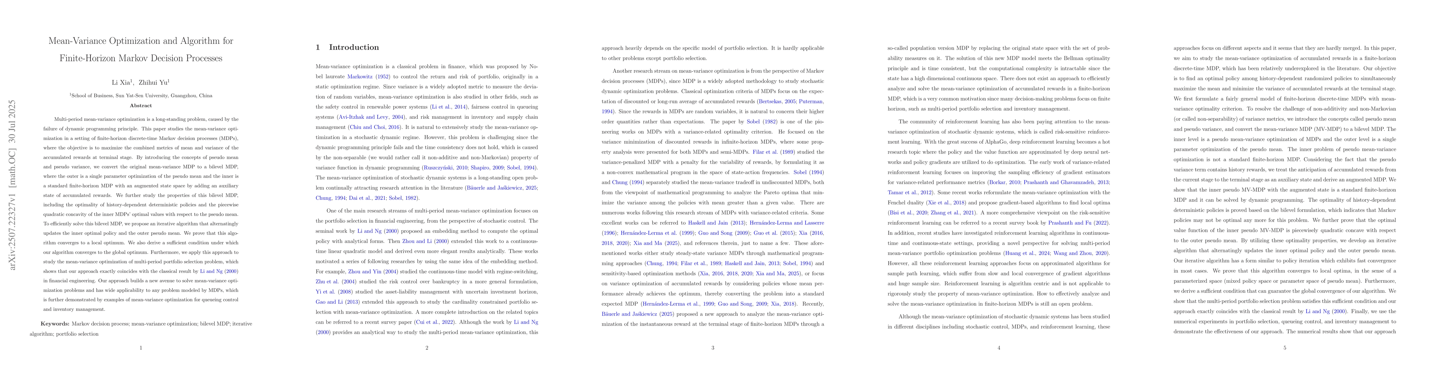 This paper introduces a method for solving multi-period mean-variance optimization problems in finite-horizon discrete-time Markov decision processes (MDPs). It transforms the original problem into a bilevel MDP, optimizing pseudo mean and variance, and proposes an iterative algorithm to efficiently solve it. The approach is applied to portfolio selection, queueing control, and inventory management, providing a new solution avenue for various MDP-modeled problems.