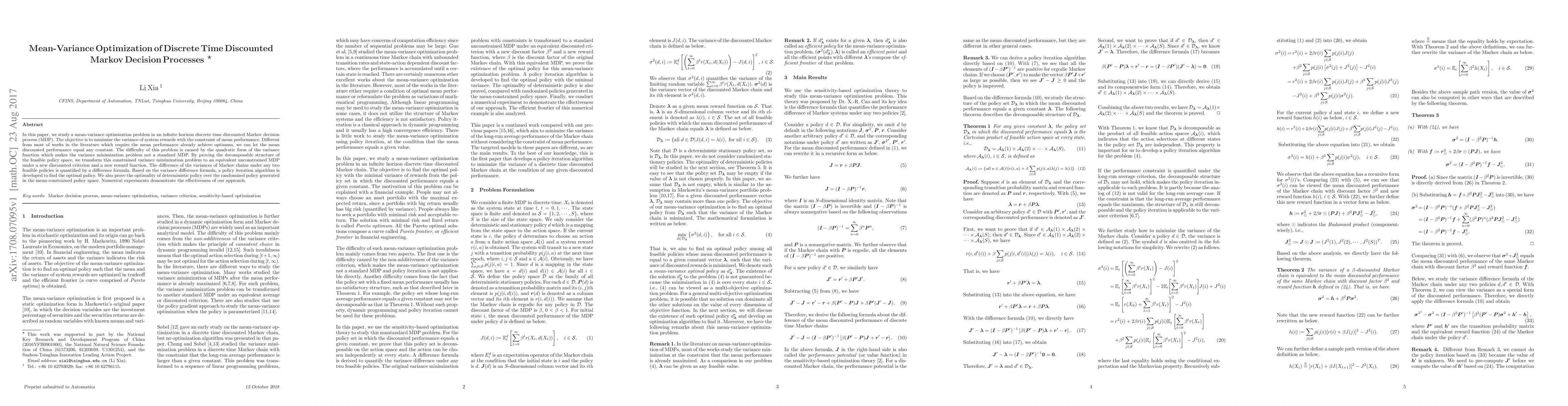 This paper addresses mean-variance optimization in infinite horizon discrete time discounted Markov decision processes, focusing on minimizing variance while achieving a specified mean performance. It transforms the constrained variance problem into an equivalent unconstrained MDP, develops a policy iteration algorithm, and proves the optimality of deterministic policies. Numerical experiments validate the approach.