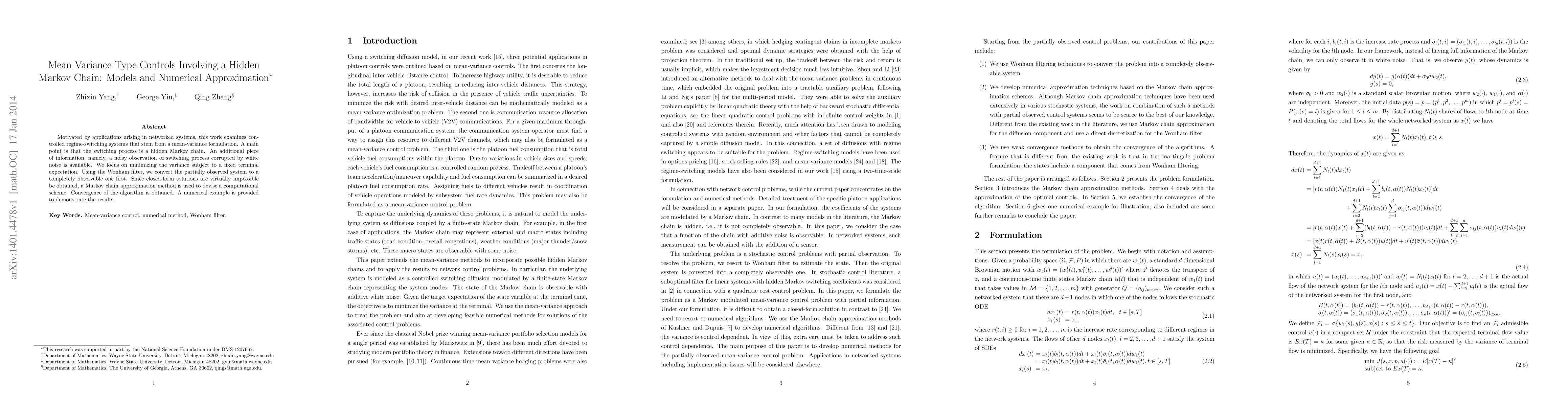 Motivated by applications arising in networked systems, this work examines controlled regime-switching systems that stem from a mean-variance formulation. A main point is that the switching process is a hidden Markov chain. An additional piece of information, namely, a noisy observation of switching process corrupted by white noise is available. We focus on minimizing the variance subject to a fixed terminal expectation. Using the Wonham filter, we convert the partially observed system to a completely observable one first. Since closed-form solutions are virtually impossible be obtained, a Markov chain approximation method is used to devise a computational scheme. Convergence of the algorithm is obtained. A numerical example is provided to demonstrate the results.