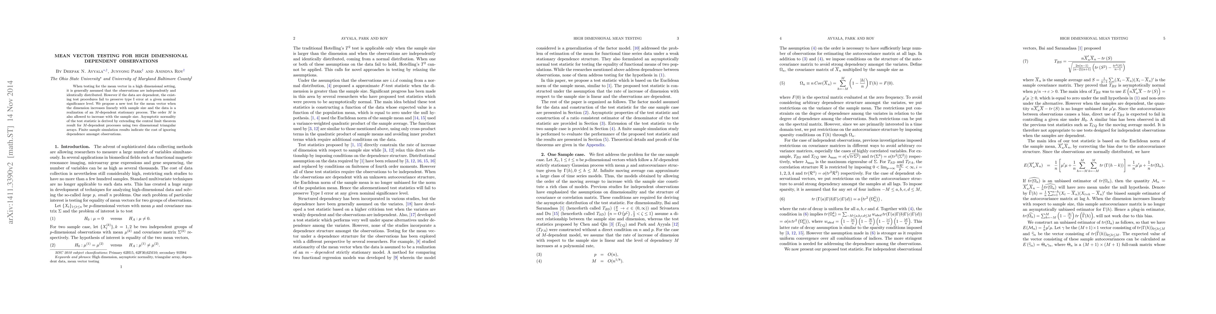 When testing for the mean vector in a high dimensional setting, it is generally assumed that the observations are independently and identically distributed. However if the data are dependent, the existing test procedures fail to preserve type I error at a given nominal significance level. We propose a new test for the mean vector when the dimension increases linearly with sample size and the data is a realization of an M -dependent stationary process. The order M is also allowed to increase with the sample size. Asymptotic normality of the test statistic is derived by extending the central limit theorem result for M -dependent processes using two dimensional triangular arrays. Finite sample simulation results indicate the cost of ignoring dependence amongst observations.