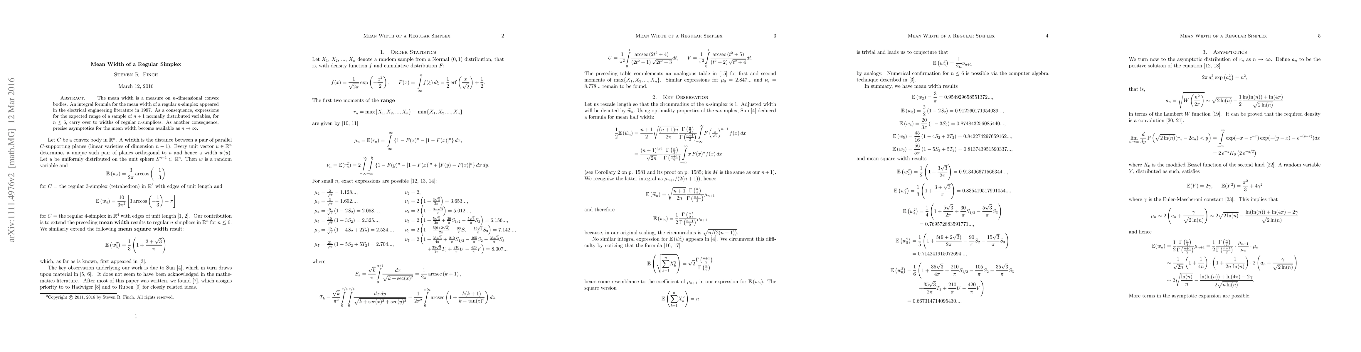 The mean width is a measure on n-dimensional convex bodies. An integral formula for the mean width of a regular n-simplex appeared in the electrical engineering literature in 1997. As a consequence, expressions for the expected range of a sample of n+1 normally distributed variables, for n<=6, carry over to widths of regular n-simplices. As another consequence, precise asymptotics for the mean width become available as n->infty.