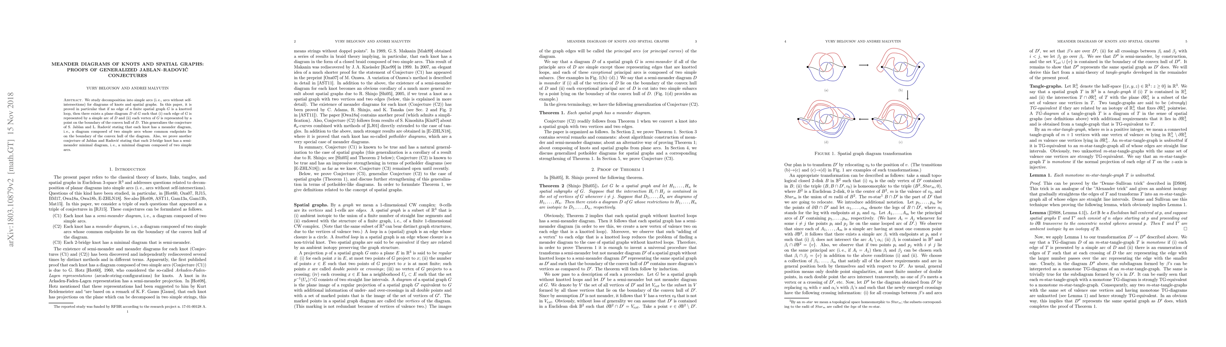 This paper proves generalized conjectures by Jablan and Radović on the decomposition of knot and spatial graph diagrams into simple arcs, confirming that if no edge is a knotted loop, a plane diagram exists where each edge is represented by a simple arc, and each vertex by a boundary point of the diagram's convex hull. It also verifies that 2-bridge knots have minimal semi-meander diagrams composed of two simple arcs.