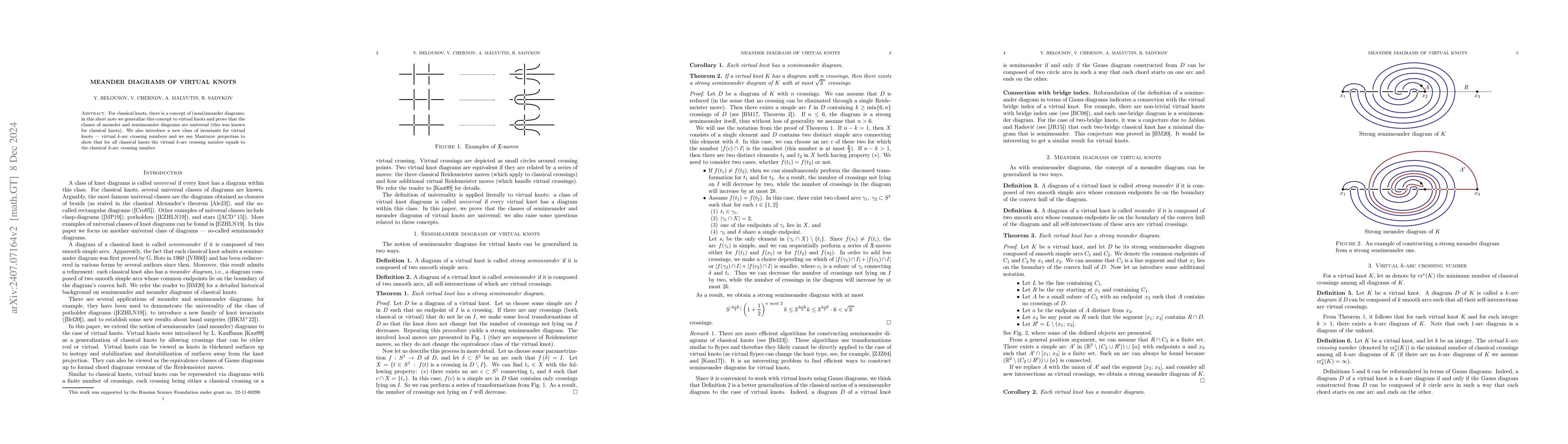 For classical knots, there is a concept of (semi)meander diagrams; in this short note we generalize this concept to virtual knots and prove that the classes of meander and semimeander diagrams are universal (this was known for classical knots). We also introduce a new class of invariants for virtual knots -- virtual $k$-arc crossing numbers and we use Manturov projection to show that for all classical knots the virtual $k$-arc crossing number equals to the classical $k$-arc crossing number.