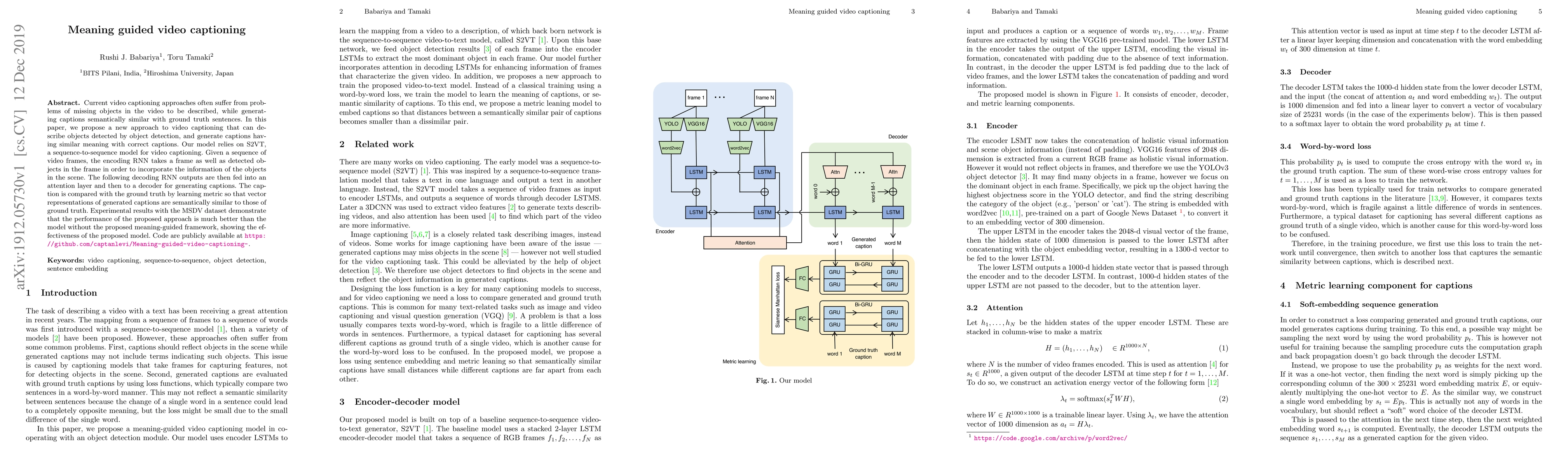 This paper proposes a new video captioning method that incorporates detected objects to generate semantically accurate captions. The model uses S2VT, encoding detected objects into the sequence-to-sequence framework, and employs an attention layer to improve caption quality, achieving better results than traditional models on the MSDV dataset.