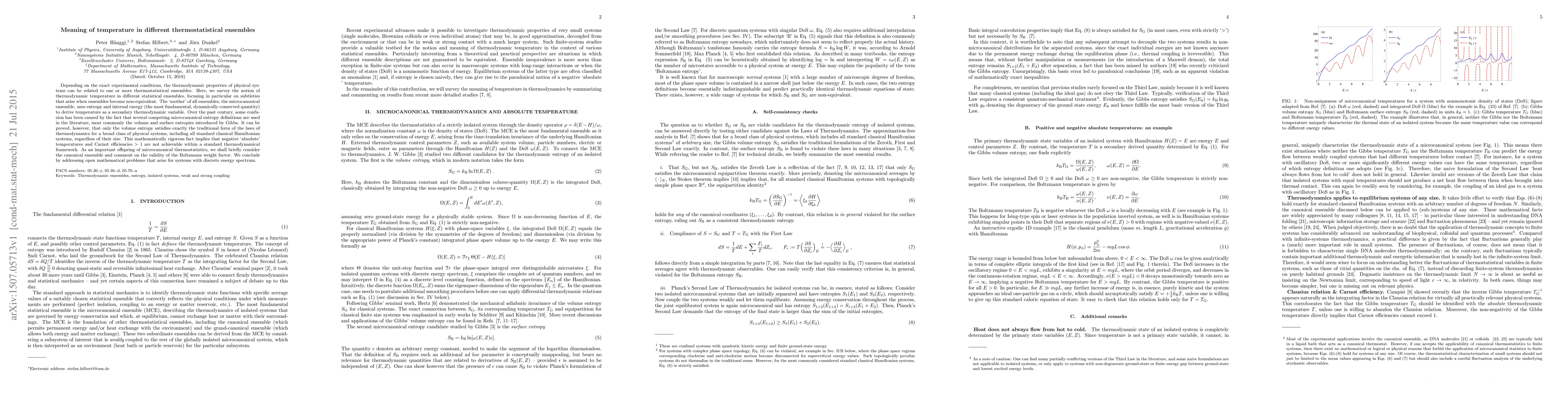 Depending on the exact experimental conditions, the thermodynamic properties of physical systems can be related to one or more thermostatistical ensembles. Here, we survey the notion of thermodynamic temperature in different statistical ensembles, focusing in particular on subtleties that arise when ensembles become non-equivalent. The 'mother' of all ensembles, the microcanonical ensemble, uses entropy and internal energy (the most fundamental, dynamically conserved quantity) to derive temperature as a secondary thermodynamic variable. Over the past century, some confusion has been caused by the fact that several competing microcanonical entropy definitions are used in the literature, most commonly the volume and surface entropies introduced by Gibbs. It can be proved, however, that only the volume entropy satisfies exactly the traditional form of the laws of thermodynamics for a broad class of physical systems, including all standard classical Hamiltonian systems, regardless of their size. This mathematically rigorous fact implies that negative 'absolute' temperatures and Carnot efficiencies $>1$ are not achievable within a standard thermodynamical framework. As an important offspring of microcanonical thermostatistics, we shall briefly consider the canonical ensemble and comment on the validity of the Boltzmann weight factor. We conclude by addressing open mathematical problems that arise for systems with discrete energy spectrum.