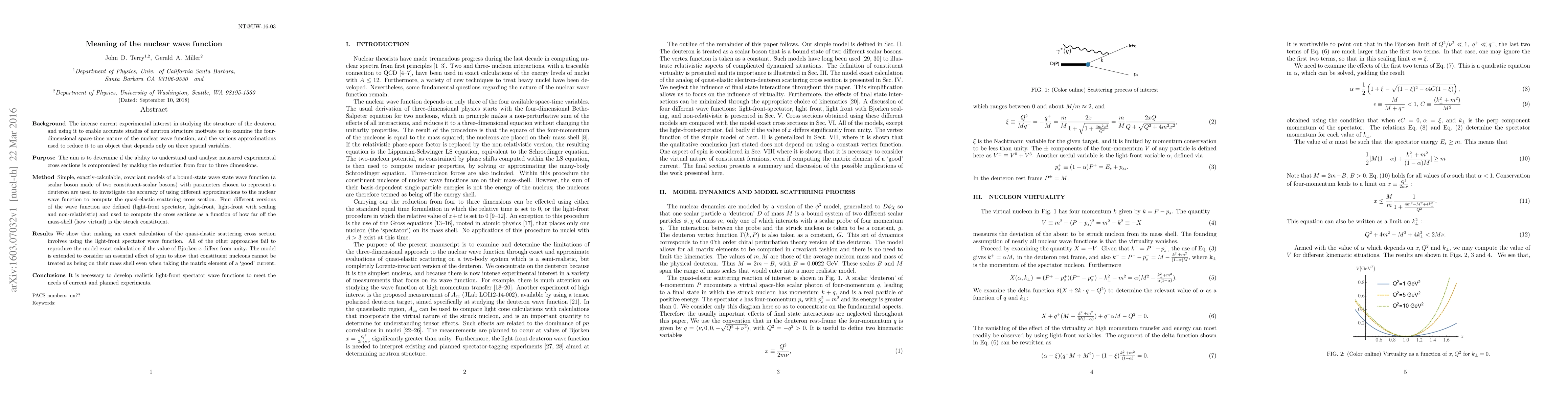 Background The intense current experimental interest in studying the structure of the deuteron and using it to enable accurate studies of neutron structure motivate us to examine the four-dimensional space-time nature of the nuclear wave function, and the various approximations used to reduce it to an object that depends only on three spatial variables. Purpose: The aim is to determine if the ability to understand and analyze measured experimental cross sections is compromised by making the reduction from four to three dimensions. Method: Simple, exactly-calculable, covariant models of a bound-state wave state wave function (a scalar boson made of two constituent-scalar bosons) with parameters chosen to represent a deuteron are used to investigate the accuracy of using different approximations to the nuclear wave function to compute the quasi-elastic scattering cross section. Four different versions of the wave function are defined (light-front spectator, light-front, light-front with scaling and non-relativistic) and used to compute the cross sections as a function of how far off the mass-shell (how virtual) is the struck constituent. Results: We show that making an exact calculation of the quasi-elastic scattering cross section involves using the light-front spectator wave function. All of the other approaches fail to reproduce the model exact calculation if the value of Bjorken $x$ differs from unity. The model is extended to consider an essential effect of spin to show that constituent nucleons cannot be treated as being on their mass shell even when taking the matrix element of a `good' current. Conclusions: It is necessary to develop realistic light-front spectator wave functions to meet the needs of current and planned experiments.