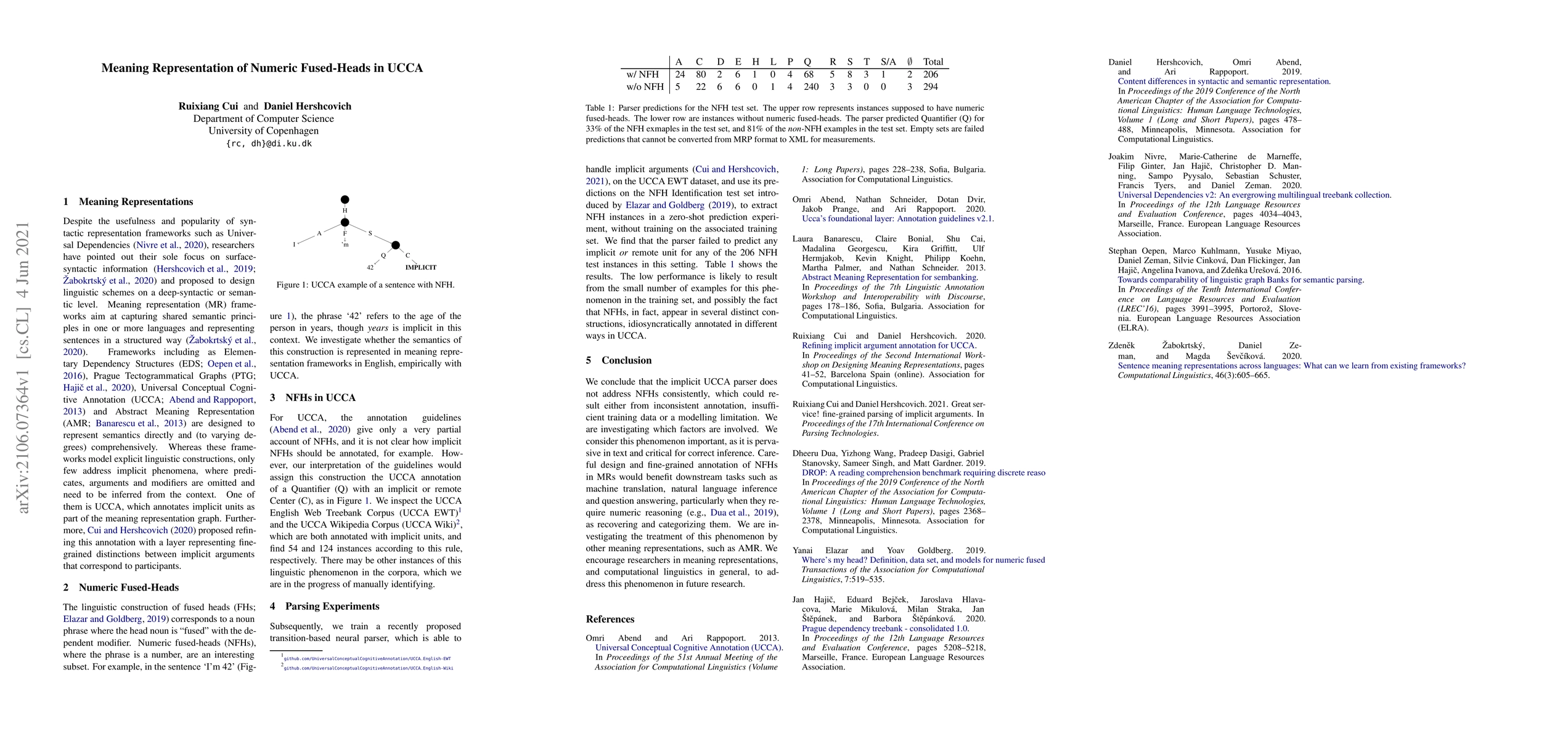 We exhibit that the implicit UCCA parser does not address numeric fused-heads (NFHs) consistently, which could result either from inconsistent annotation, insufficient training data or a modelling limitation. and show which factors are involved. We consider this phenomenon important, as it is pervasive in text and critical for correct inference. Careful design and fine-grained annotation of NFHs in meaning representation frameworks would benefit downstream tasks such as machine translation, natural language inference and question answering, particularly when they require numeric reasoning, as recovering and categorizing them. We are investigating the treatment of this phenomenon by other meaning representations, such as AMR. We encourage researchers in meaning representations, and computational linguistics in general, to address this phenomenon in future research.