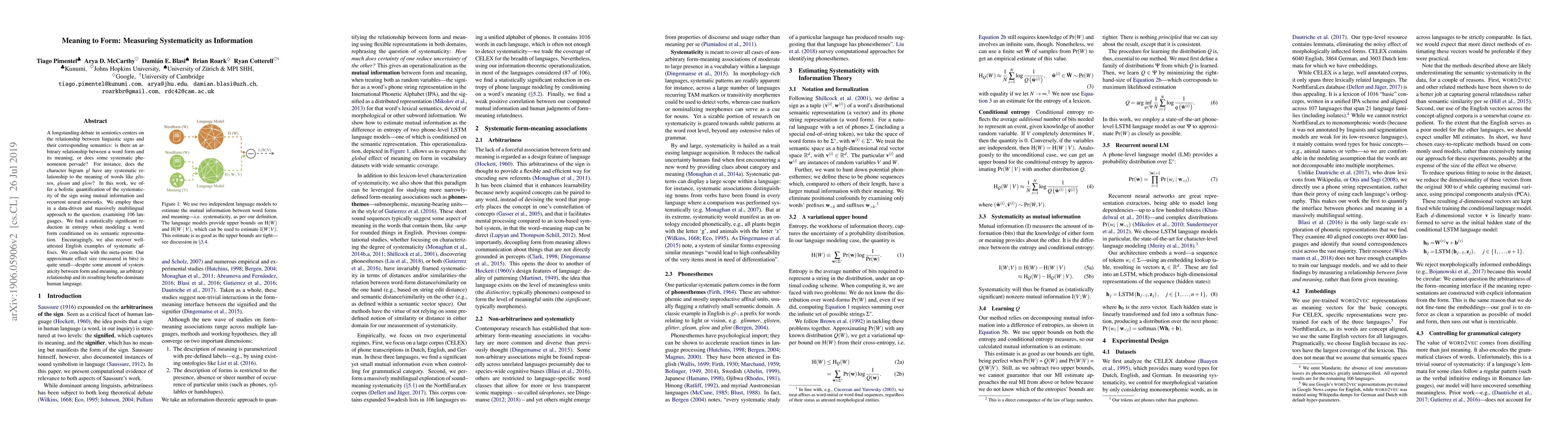 A longstanding debate in semiotics centers on the relationship between linguistic signs and their corresponding semantics: is there an arbitrary relationship between a word form and its meaning, or does some systematic phenomenon pervade? For instance, does the character bigram \textit{gl} have any systematic relationship to the meaning of words like \textit{glisten}, \textit{gleam} and \textit{glow}? In this work, we offer a holistic quantification of the systematicity of the sign using mutual information and recurrent neural networks. We employ these in a data-driven and massively multilingual approach to the question, examining 106 languages. We find a statistically significant reduction in entropy when modeling a word form conditioned on its semantic representation. Encouragingly, we also recover well-attested English examples of systematic affixes. We conclude with the meta-point: Our approximate effect size (measured in bits) is quite small---despite some amount of systematicity between form and meaning, an arbitrary relationship and its resulting benefits dominate human language.