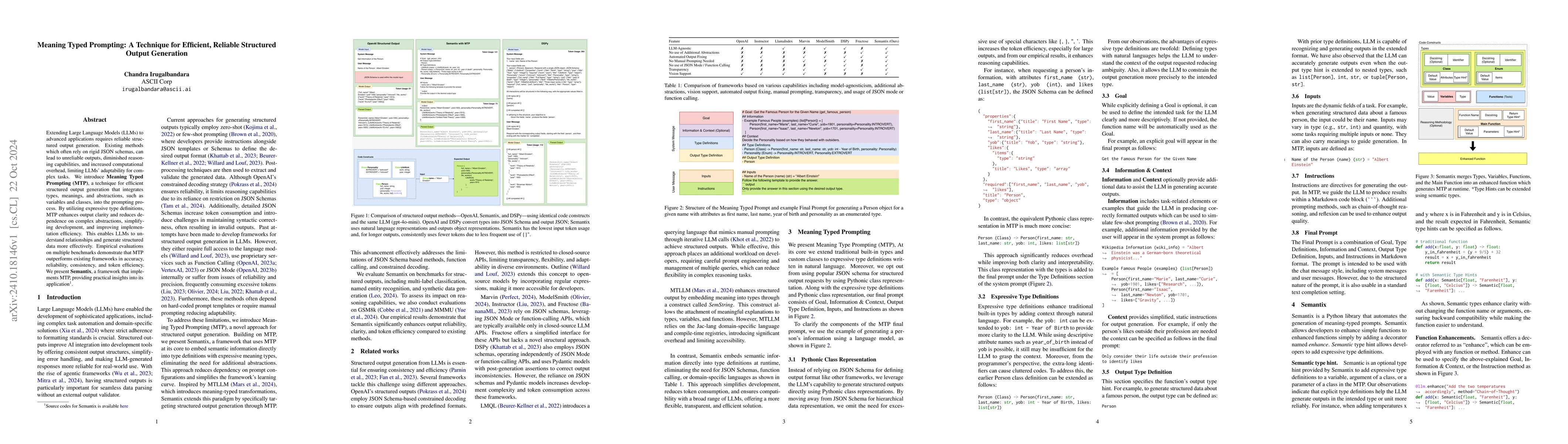**Summary:** Meaning Typed Prompting (MTP) enhances structured output generation for Large Language Models by integrating type definitions, meanings, and abstractions into prompts, leading to improved accuracy, reliability, and efficiency. Semantix, implementing MTP, outperforms existing methods in empirical evaluations.