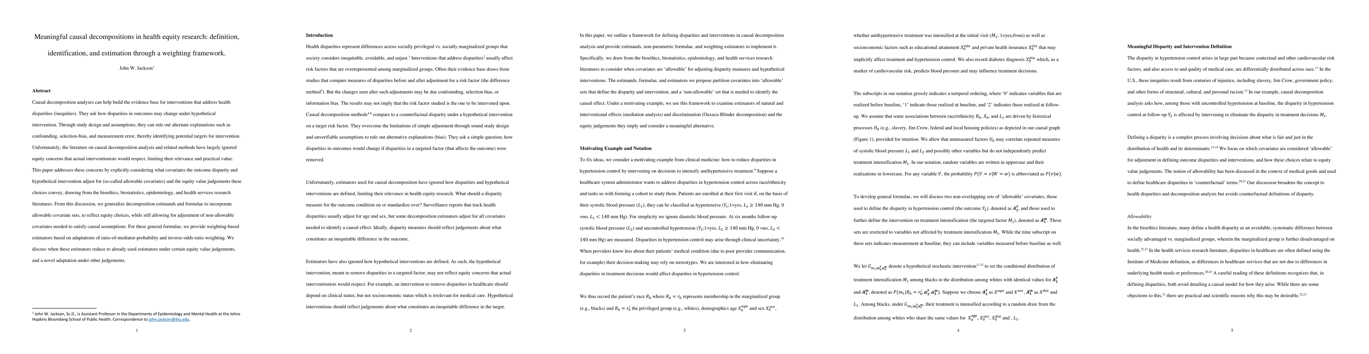 This paper develops a framework for causal decomposition analyses in health equity research, focusing on identifying and estimating meaningful disparities through a weighting approach. It introduces generalized decomposition methods that incorporate equity-sensitive covariates and provides new weighting estimators to reflect these choices while addressing confounding and bias.