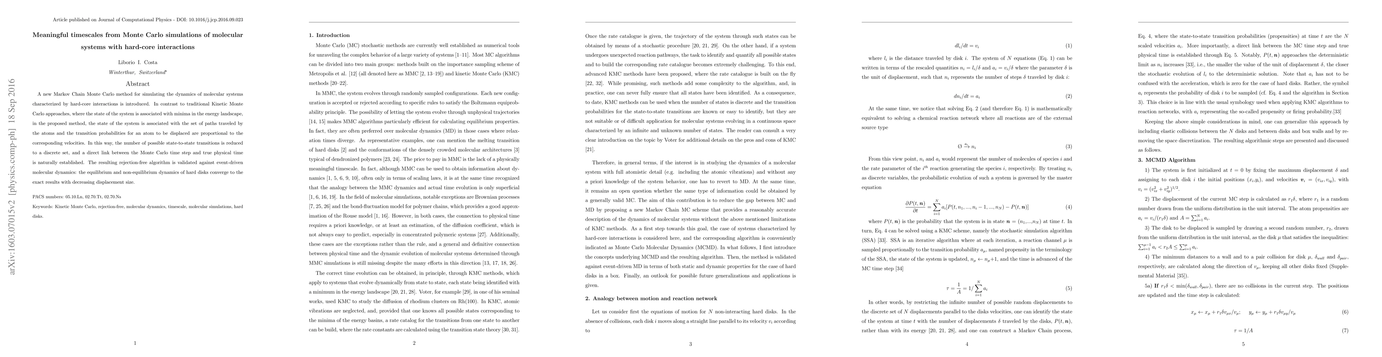 This paper introduces a novel Markov Chain Monte Carlo method for simulating molecular systems with hard-core interactions, establishing a direct link between Monte Carlo time steps and physical time by associating system states with atom paths and velocities. The proposed rejection-free algorithm is validated against event-driven molecular dynamics, showing convergence to exact results.