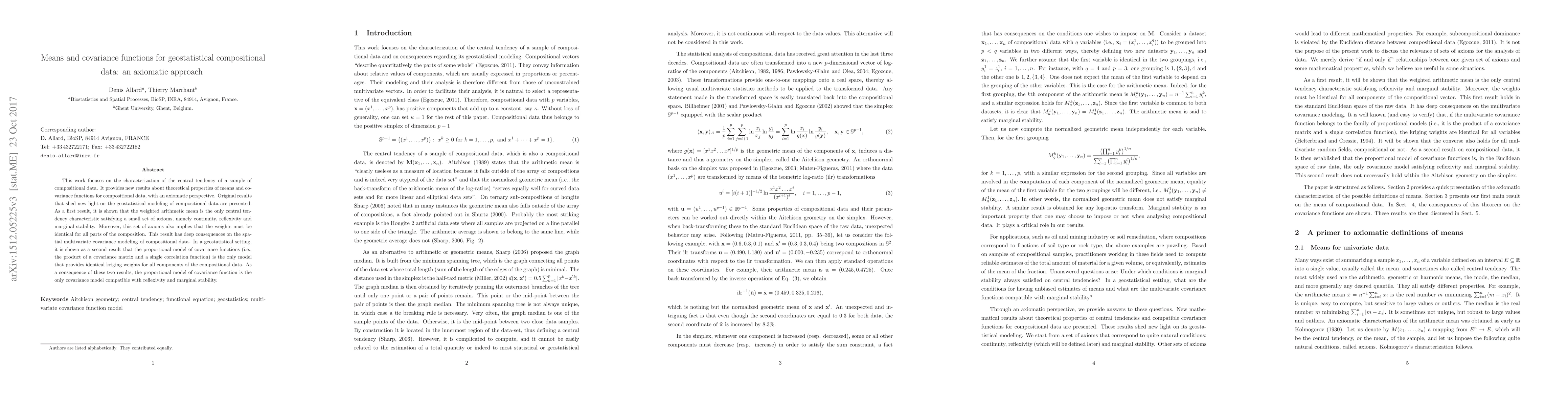This work focuses on the characterization of the central tendency of a sample of compositional data. It provides new results about theoretical properties of means and covariance functions for compositional data, with an axiomatic perspective. Original results that shed new light on the geostatistical modeling of compositional data are presented. As a first result, it is shown that the weighted arithmetic mean is the only central tendency characteristic satisfying a small set of axioms, namely continuity, reflexivity and marginal stability. Moreover, this set of axioms also implies that the weights must be identical for all parts of the composition. This result has deep consequences on the spatial multivariate covariance modeling of compositional data. In a geostatistical setting, it is shown as a second result that the proportional model of covariance functions (i.e., the product of a covariance matrix and a single correlation function) is the only model that provides identical kriging weights for all components of the compositional data. As a consequence of these two results, the proportional model of covariance function is the only covariance model compatible with reflexivity and marginal stability.