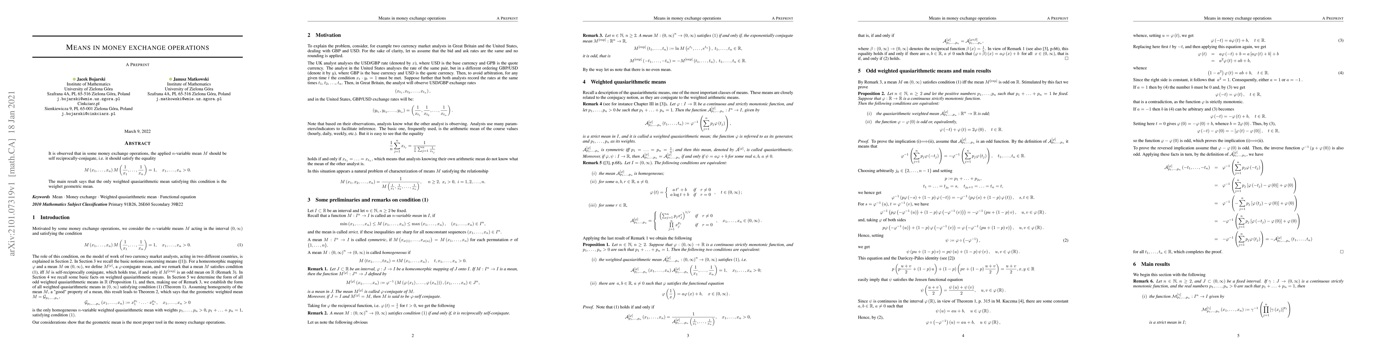 It is observed that in some money exchange operations, the applied $n$ -variable mean $M$ should be self reciprocally-conjugate, i.e. it should satisfy the equality \[ M\left( x_{1},\ldots,x_{n}\right) M\left( \frac{1}{x_{1}},\ldots,\frac{1}{x_{n}} \right) =1,\quad x_{1},\ldots,x_{n}>0. \] The main result says that the only weighted quasiarithmetic mean satisfying this condition is the weighet geometric mean.