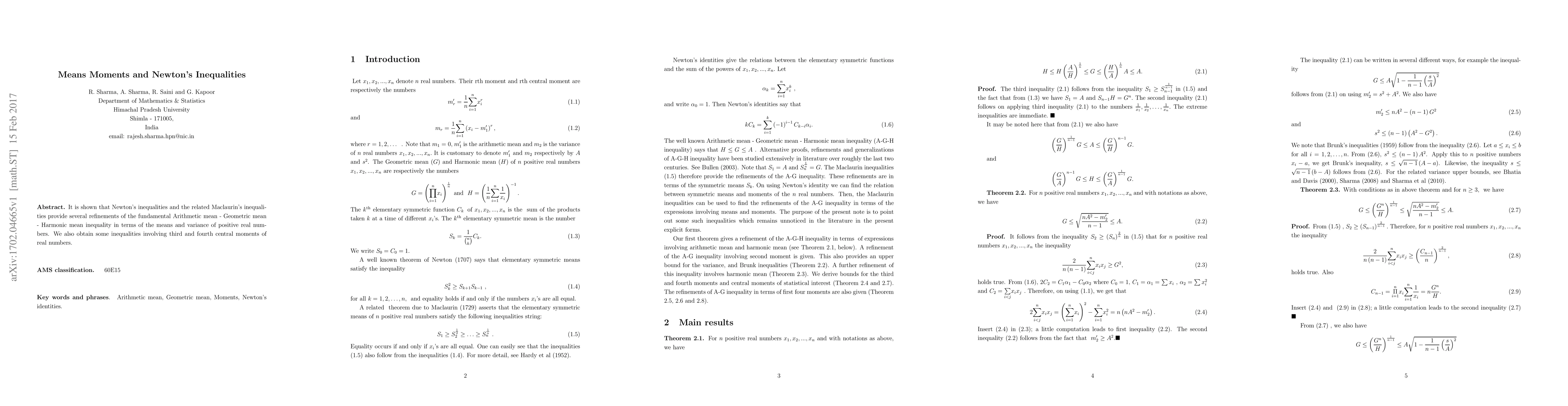This paper demonstrates that Newton's inequalities and Maclaurin's inequalities refine the Arithmetic Mean-Geometric Mean-Harmonic Mean inequality using means and variance of positive real numbers. It also presents inequalities involving third and fourth central moments of real numbers.
